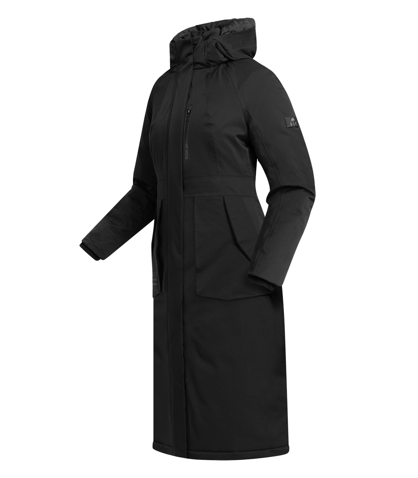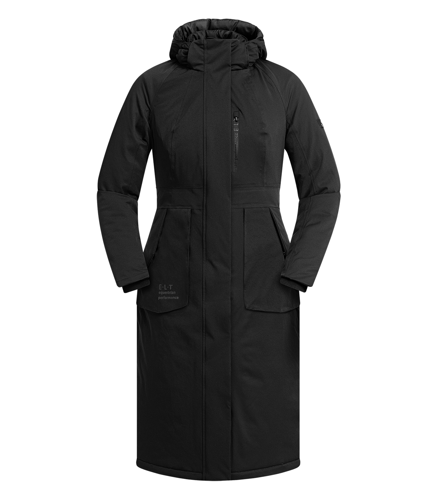 Abrigo de equitación de invierno muy funcional con un amplio equipamiento – Corte ligeramente entallado – Ancho ajustable en la cintura – Acolchado integral – Costuras selladas – Impermeable, columna de agua de 5000 mm) – Material transpirable, 3000 g/m²/24 h – Cortavientos – Capucha desmontable con visera acolchada con letras «E·L·T» reflectantes – Capucha ajustable y fijable en la espalda – Visera desmontable de la capucha – Cuello que se cierra hasta arriba – Bolsillo en el pecho con cremallera impermeable con tirador semibloqueante y letras «E·L·T Equestrian Performance» – Cremallera bidireccional de alta calidad con aspecto metálico y protector de barbilla – Tirador de cremallera metálico con cinta acanalada con logotipo en 3D – La cremallera termina por encima de la silla de montar para proteger el cuero – Dos grandes bolsillos con solapa y botones a presión y forro polar calientamanos. Bolsillo derecho con letras «E·L·T Equestrian Performance» – Separación de la cintura con pretina tipo túnel y banda acanalada con botones de presión para ajustar el ancho – Extremos de las mangas con puños de canalé en el interior – Tapeta delantera encolada y con botones de presión ocultos – Correas interiores para las piernas, ajustables con botones a presión – Estampado reflectante en las mangas – Insignia decorativa de grogrén con logotipo «E·L·T» estampado de silicona – Rajas para montar con cremallera y tirador semibloqueante con letras «E·L·T» – Rajas para montar en el interior con estampado reflectante del logotipo «E·L·T» a la izquierda y letras de «E·L·T Equestrian Performance» a la derecha. Material superior: 90 % poliamida, 10 % elastano – Forro: 100 % poliéster – Acolchado: 100 % poliéster