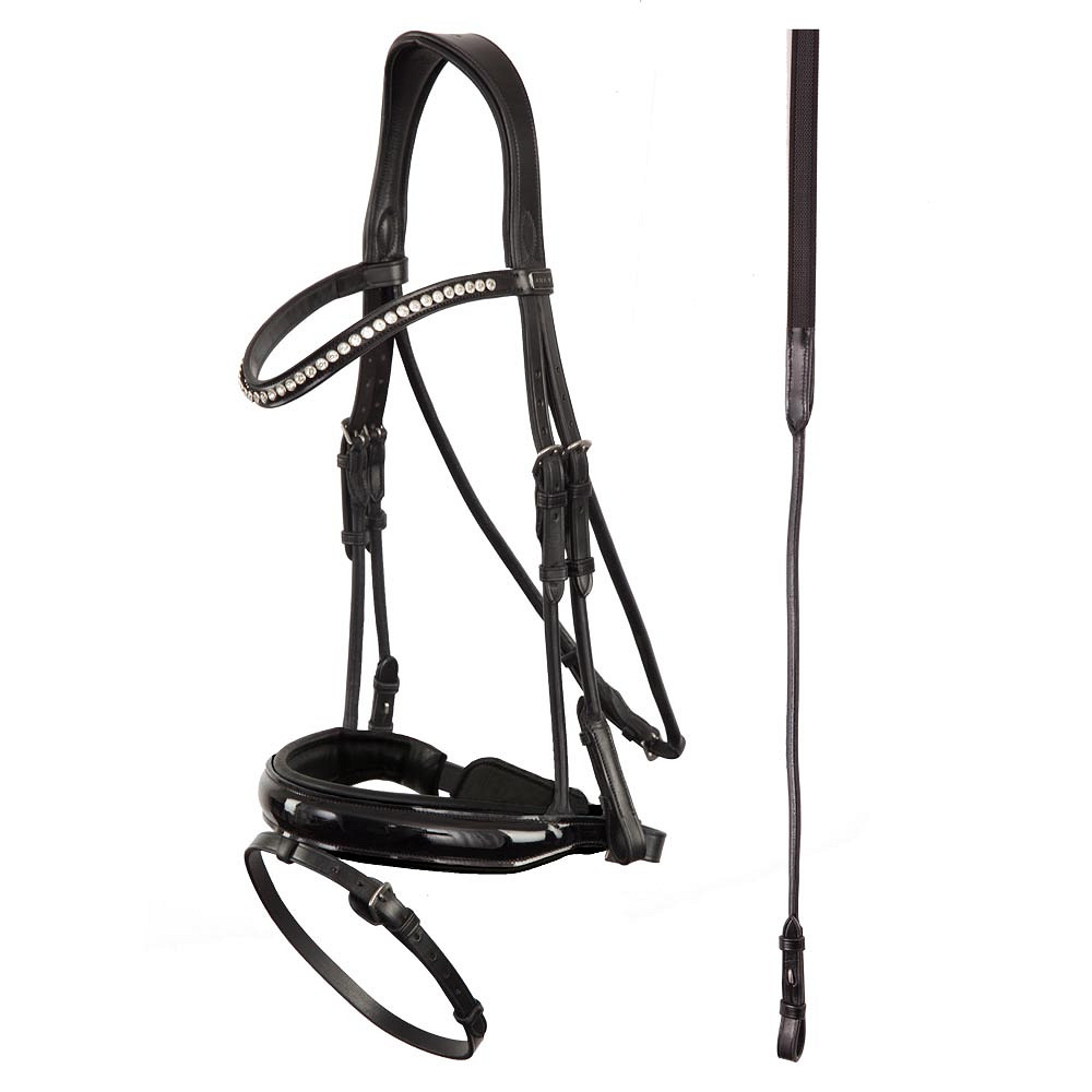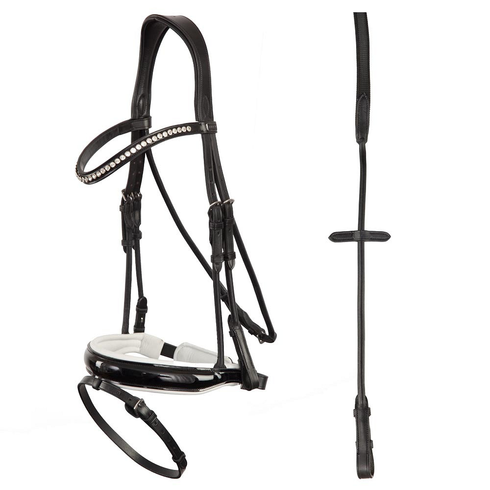 Anky Bridle ATH16003, cuero de patente, canto bling-byling y costuras redondas … ¡esta brida anky lo tiene todo! Esta brida simétrica de Anky está hecha del mejor cuero inglés. Su tocado de forma anatómica presenta un relleno de cuero suave y proporciona libertad adicional detrás de las orejas del caballo gracias a su forma redonda. La brida tiene una banda de cejas estrecha y curva con piedras gemeras sintéticas brillantes en remaches firmemente fijados y una cara de cuero suave. La garganta es ajustable con una hebilla en la parte inferior. La garganta, los pómulos y las correas de la banda nasal están hechas de cuero enrollado. Los mejillas están equipados con palanquillas de gancho. La banda de nariz flash de manivela extra ancha (aproximadamente 4.8 cm) está cubierta con cuero de patente para un aspecto glamoroso. La banda nasal está elevada, suavemente acolchada y equipada con una almohadilla de barbilla ancha. La forma anatómica de la banda nasal proporciona más espacio para los anillos de bits. El accesorio de flash tiene forma de V y la hebilla de correa de flash presenta una solapa de protección. La brida presenta accesorios brillantes de color plateado hechos de latón cromado y viene con riendas de agarre web (20 mm de ancho) con extremos enrollados. Las riendas se tejen con caucho para agarre adicional.