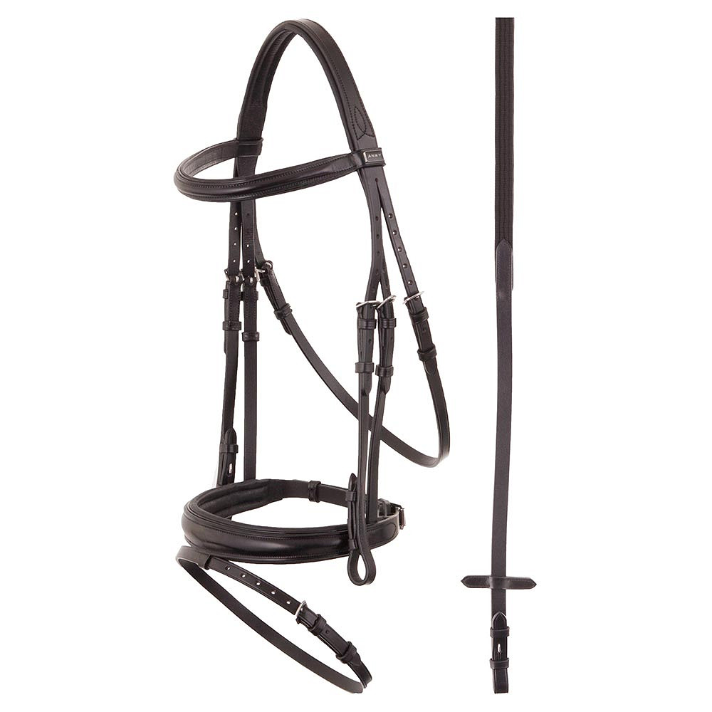 Anky en forma de brida Ath13003 Anky en forma de brida ATH13003, la brida de banda nasal en forma está hecha de cuero inglés y bronceado de alta calidad, cuero inglés. La alta calidad del cuero garantiza una larga vida para la brida. La brida está provista de un tocado acolchado y un bancario nasal de manivela acolchado amplio y súper suave con flash. La banda nasal tiene una forma de tuberías de patente subhiles. ¡La brida tiene una apariencia sofisticada y hará que tus caballos se dirigen aún más bonitos! La brida viene con riendas el mejor producto épestre de competición en tiende hípica el Estribo Alicante +34648425534