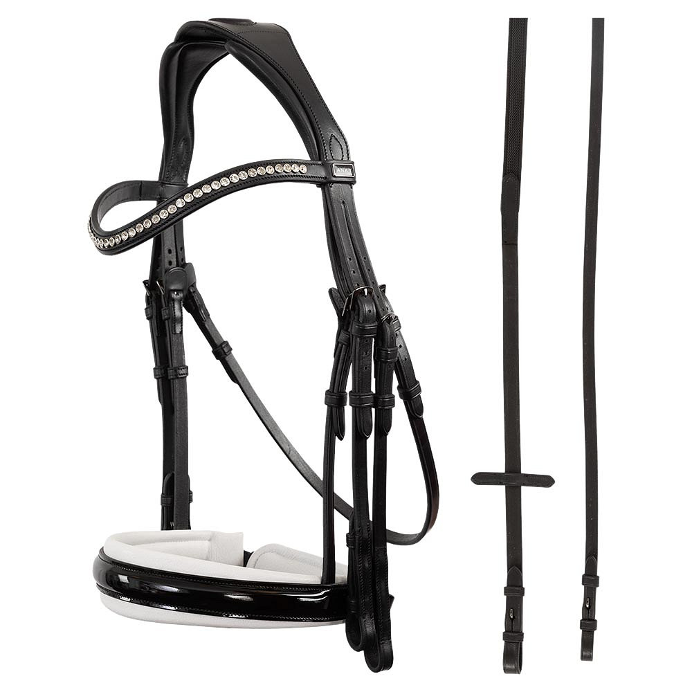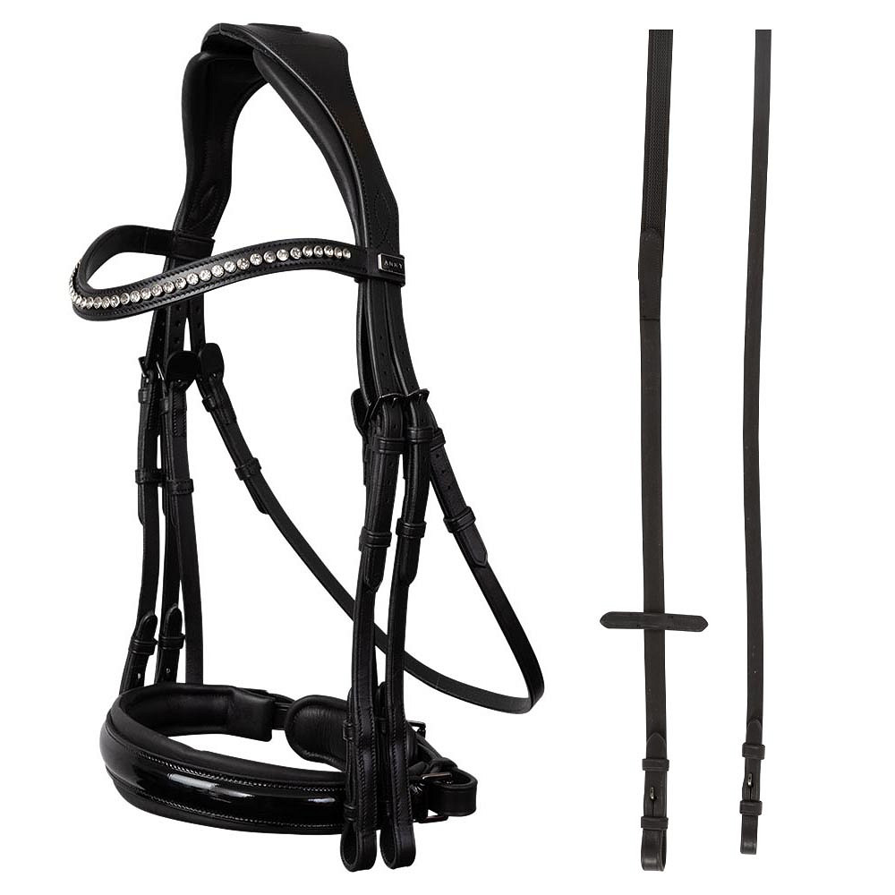 ANKY Weymouth Bridle Comfort Fit ATH22001, • Anatomical headpiece that relieves pressure on sensitive nerves • Extra soft padded noseband for optimal comfort • Stylish design with Stellux™ stones and patent leather PRODUCT INFORMATION Description : ¿Están usted y su caballo listo para montar con una brida de Weymouth? Esta brida anatómica hecha de cuero inglés de alta calidad se mantiene hermosa durante mucho tiempo, se adapta perfectamente a la cabeza de los caballos y está equipado con todas las comodidades. Características del producto: el casco y la banda nasal están suavemente acolchados para una comodidad óptima y una buena distribución de presión. La banda nasal contiene relleno de 10 mm y está cubierta de cuero de patente en el exterior. Las hebillas de color metal de pistola tienen una solapa protectora donde la hebilla toca la cabeza de los caballos. La banda de cejas ligeramente curva está con incrustación de la moda con diamantes de imitación Stellux ™ brillantes en tazas resistentes de color plateado. Incluye riendas de cuero y goma.