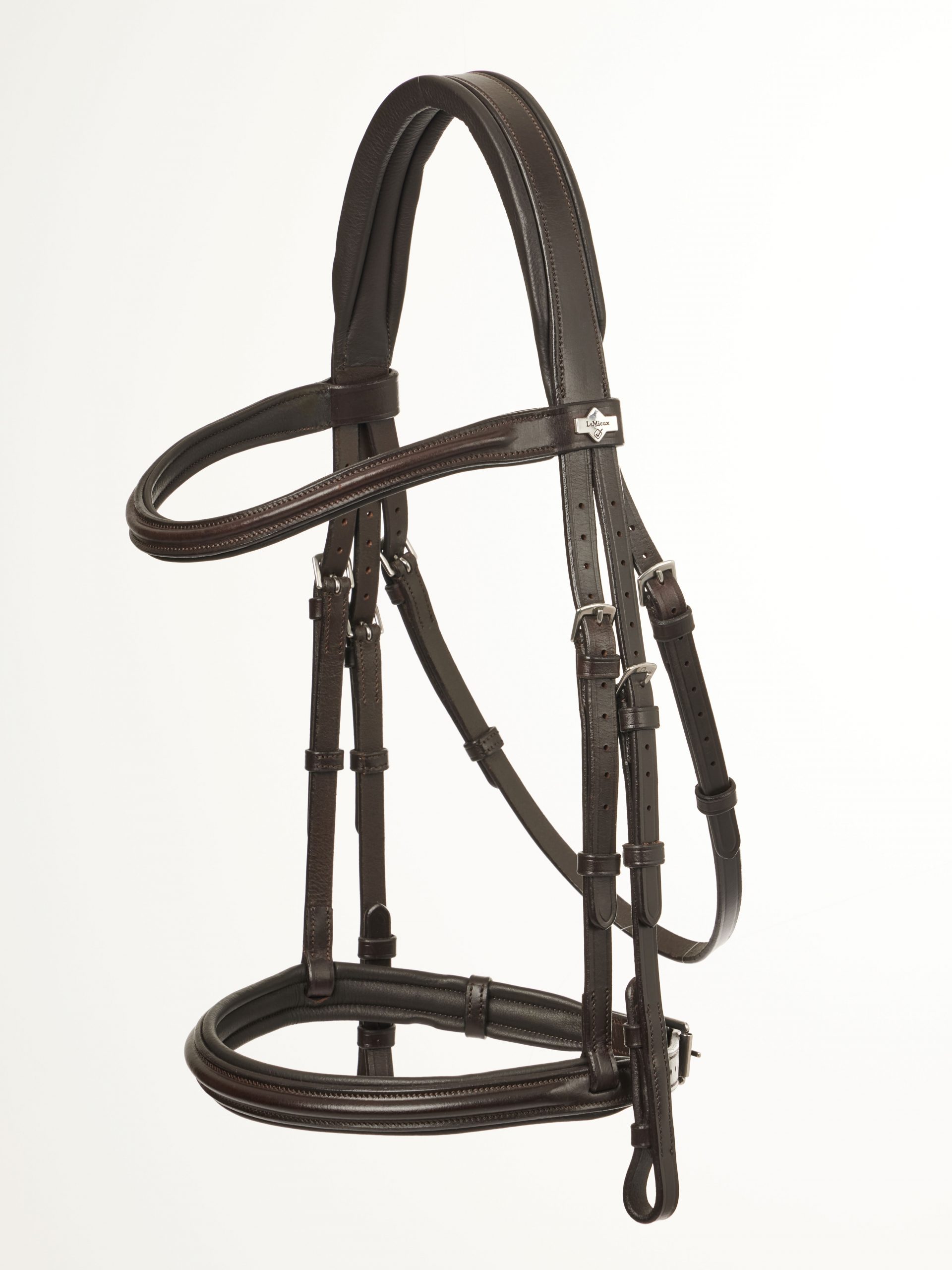 Lujosas bridas de cuero engrasado diseñado para el control con comodidad y estilo clásicos. El tocado suave y acolchado tiene forma anatómica para el espacio libre detrás de las orejas. La banda de nariz Cavesson se encuentra acolchada para la comodidad. Las hebillas dobles en la banda de la nariz y las pestañas de garganta permiten un ajuste preciso e uniforme. Enmarcando la cara, la banda de cejas acolchada tiene una elegante forma contorneada. Lemieux Leather Care Ators está en la sección Información y atención e incluye con cada brida. Recomendamos la colección de equipaje Lemieux para viajes y almacenamiento.