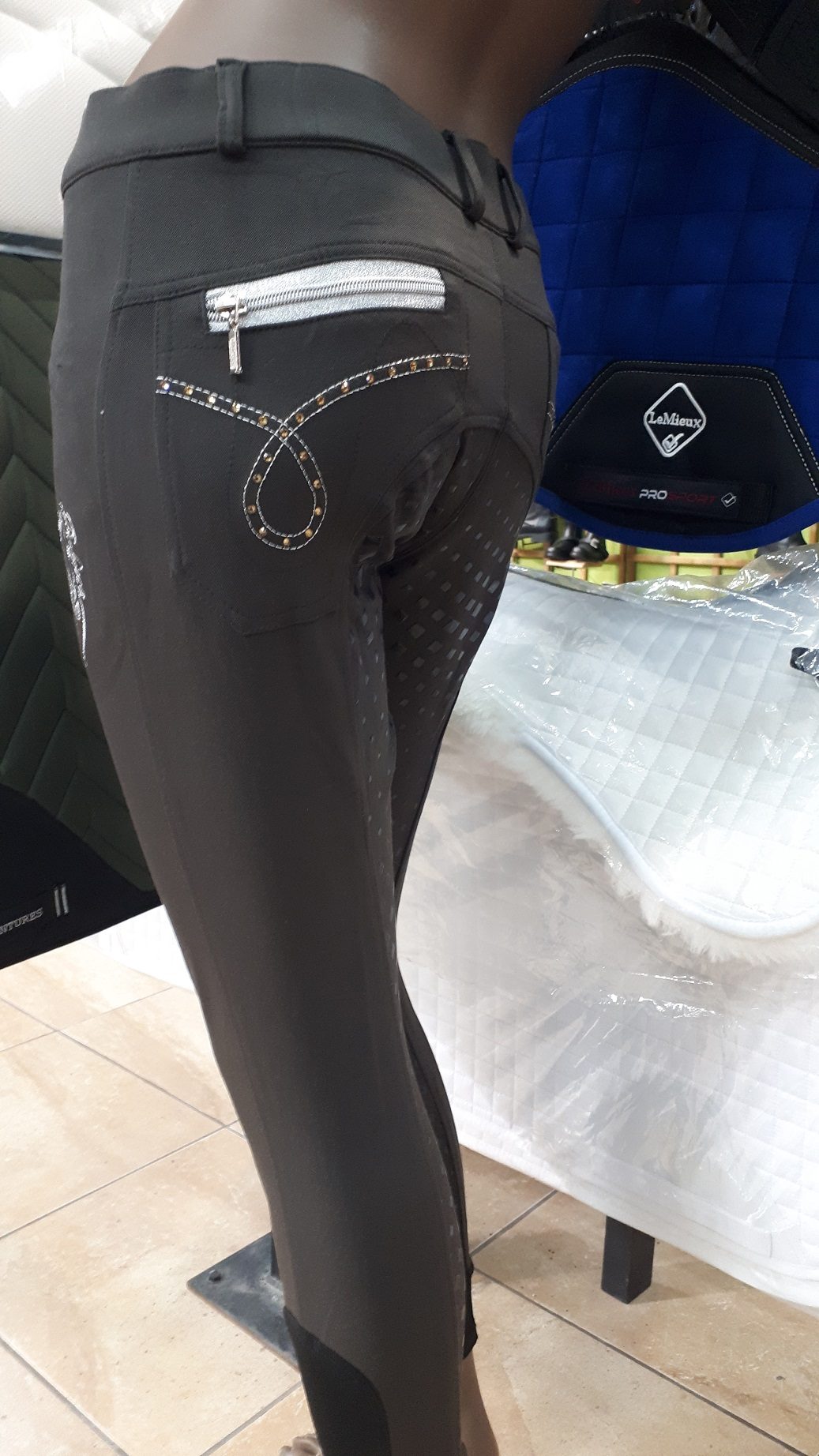 Babieca Breeches XENA FULL GRIP, confortable breeche fabricado en material técnico de microfibra, su diseño a la cadera con elevación realza el cuerpo. Estos excelentes breeches cuentan con asiento completo de silicona de alta calidad con un sobrio patrón patrón que garantiza un perfecto grip a la par de un look diferente y moderno, los bolsillos anatómicos decorados con brillantes dorados, ribete en plata y cremallera plateada harán las delicias de las amazonas. El puño elástico garantiza un ajuste perfecto tanto si montas con Bota o con botín. Este estupendo pantalón de montar a un excelente precio, solo 59.95€.