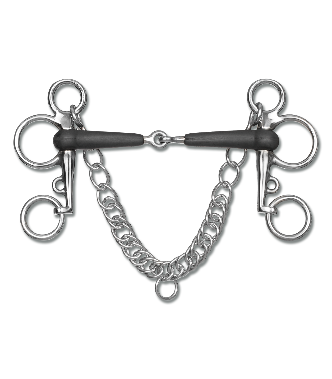 con barras móviles y barbada Las nuevas embocaduras Waldhausen de goma están confeccionadas de poliuretano inalterable por comestibles. La embocadura de goma sólo se deberá utilizar en caballos que tienden a producir suficiente saliva. Grosor: 15 mm Barra superior: 4 cm, barra inferior: 5 cm