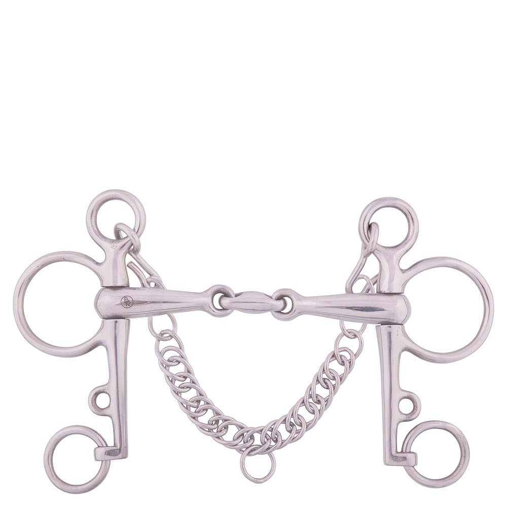 BR Pelham de doble articulación 18 mm, boquilla de doble articulación, acero inoxidable macizo, con mejillas giratorias de 140 mm de longitud. Grosor de la boquilla 18 mm. El mejor producto ecuestre de competición en tienda hípica El Estribo Alicante +34648425534