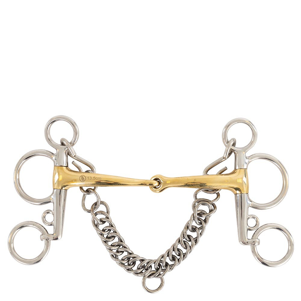 BR Pelham Baby Pelham Soft Contacto suave 14 mm, • Forma anatómica para una distribución de presión uniforme • El material ofrece un olor y sabor agradables • Anillos de acero inoxidable Descripción de la información del producto: Este bit está hecho de curigan sólido con anillos de acero inoxidable. Cuprigan es una aleación que consta de 89% de cobre, 7% de aluminio, 3% de hierro y 1% de zinc. El proceso de oxidación del material da un olor y sabor agradables. El diseño anatómico sigue la forma de la boca de los caballos, creando una distribución suave y uniforme de presión. El diseño, combinado con las propiedades únicas de Cuprigan, fomenta el proceso de masticación y la producción de saliva, lo que permite una conexión agradable con la boca del caballo sensible. Los vástagos superiores (brazos de compra) con anillo se giran ligeramente hacia afuera, lo que permite una libertad óptima de la cabeza del caballo. La broca aplica una presión aguda en la boca. Características del producto: un bit de Pelham ofrece cuatro posiciones de reinicio diferentes: una sola rienda unida al anillo central o inferior, una rienda doble o una sola rienda en combinación con redondeos de Pelham. Un bit de Pelham a menudo se usa para caballos fuertes o en situaciones que requieren más control, como mostrar saltos o eventos. Cuanto más largas sean los vástagos, más fuerte será el apalancamiento. La boquilla de un solo snaffle roto depende en un punto. Funciona principalmente en las barras, pero también ejerce presión en los bordes de la lengua, las esquinas de la boca y, a veces, en el paladar. Cuando se dan las ayudas de reinicio, el bit forma una forma de V. La lengua tiene más libertad de lo que hubiera sido con una broca de doble articulación. Grosor del portavasos: longitud de vástagos de 14 mm: 102 mm viene con cadena de acera en una caja.