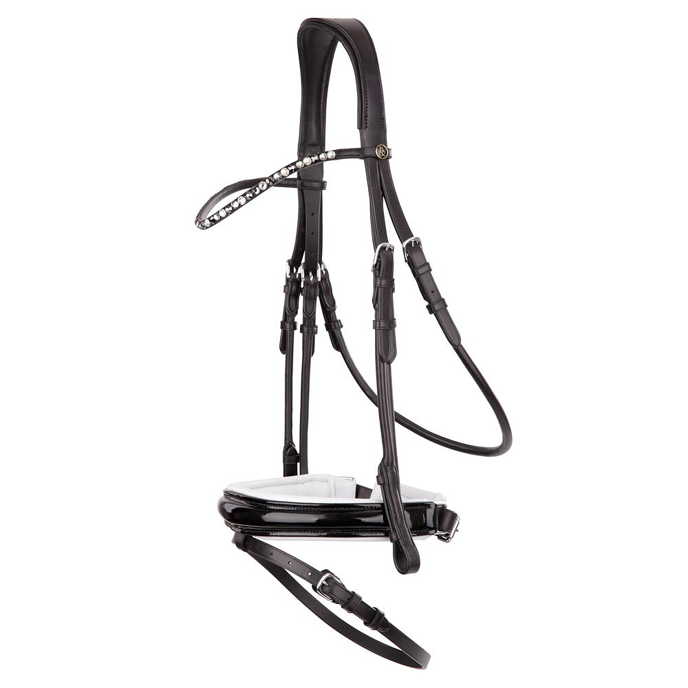 BR Bridle Andover, Brida simétrica con una testera de forma anatómica con suave forro acolchado. La frontalera estrecha y ligeramente curvada está provista de cristales austriacos de la más alta calidad en tres colores diferentes. Su muserola extra ancha (± 4,5 cm) con flash de manivela con charol tiene un relieve redondo con un acolchado suave y una almohadilla ancha para la barbilla con un acolchado suave. Además, la muserola tiene una forma anatómica. La brida tiene un accesorio de flash en forma de V y pernos de gancho y la hebilla de la correa de flash presenta una solapa de protección adicional. La muserola, la garganta y las carrilleras están hechas de cuero enrollado. La brida presenta herrajes redondos, brillantes y de color plateado. Se suministra sin riendas. El mejor producto ecuestre de competición en tienda hípica El Estribo Alicante +34648425534