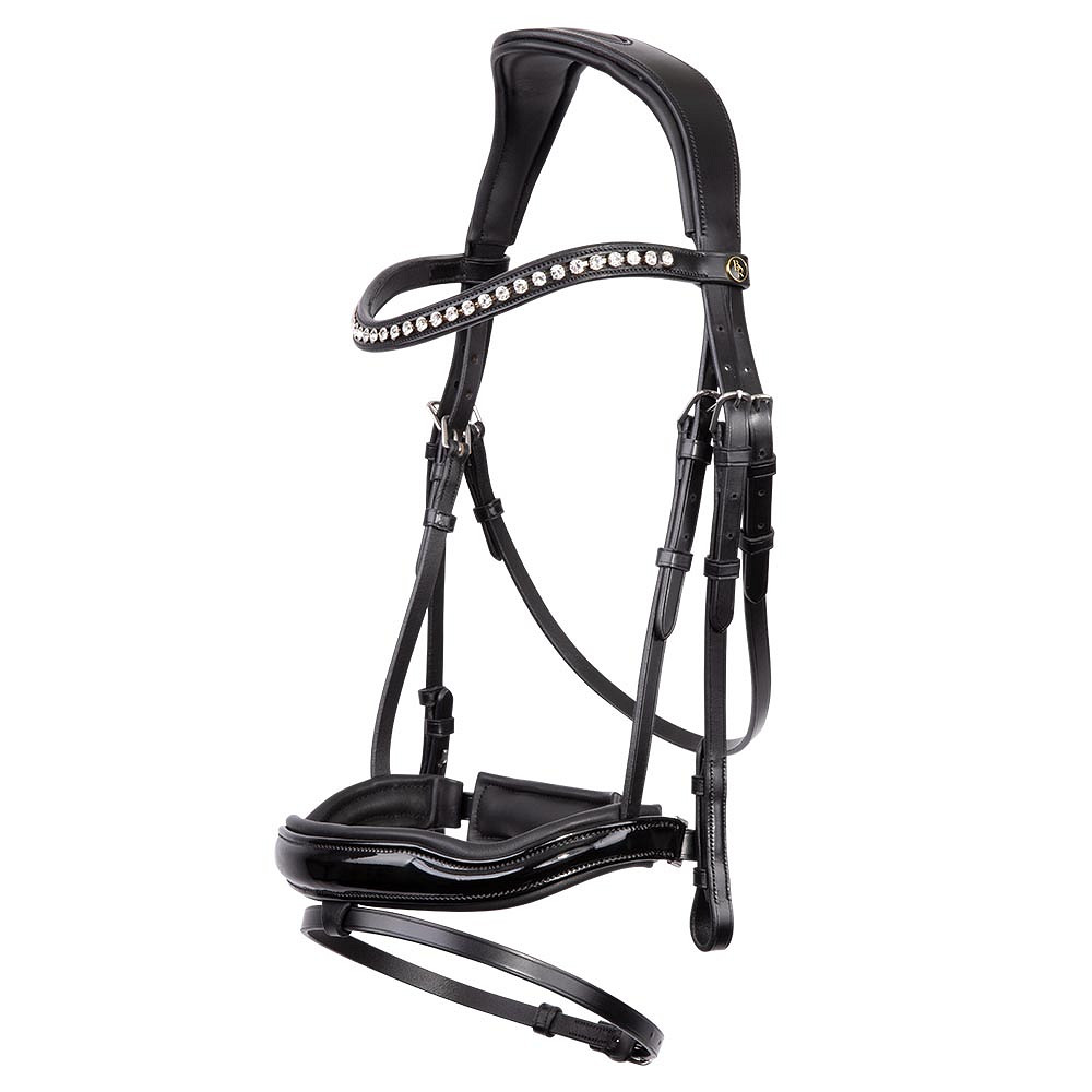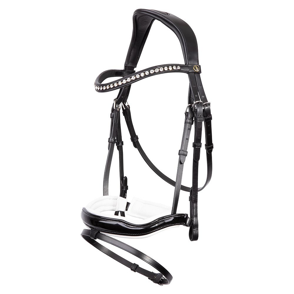 Br Bridle Bolton, el Br Bridle Bolton se destaca por su ajuste altamente cómodo, el cuero flexible y suave y los detalles de lujo. Está hecho de cuero europeo de alta calidad, que es flexible y muy duradero. El ajuste anatómico extra ancho tiene forma anatómica y suavemente acolchada. Esto garantiza un buen ajuste, una mejor distribución de presión en la cabeza del caballo y mucha comodidad. Además, la banda de nariz flash de manivela proporciona un forro elevado redondo bien acolchado y una almohadilla de barbilla ancha suavemente acolchada para completar el ajuste cómodo. El diseño especial de la banda para la nariz garantiza más espacio libre alrededor de la mandíbula y los pómulos y reduce la presión ante los sensibles nervios faciales del caballo y los dientes. La garganta es ajustable en ambos lados y la hebilla de la correa de flash presenta una aleta de protección adicional. Los detalles de lujo se pueden encontrar en la banda de cejas ligeramente curvada y la banda nasal. La banda de cejas contiene cristales brillantes y transparentes de Stellux ™ y la banda de nariz flash de manivela proporciona cuero de patente. La brida presenta hardware brillante, de color plateado y chapado en cromo.