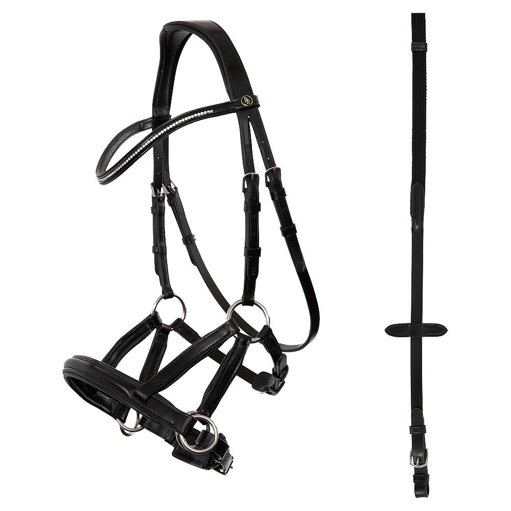 Br Bridle Lewes Side & Pull, este lado de brida sin bits sin forma anatómica proporciona un relleno suave en varios puntos y se destaca por su hardware brillante e imitación de diamantes. El cuero suavemente acolchado en la banda de la nariz y el tocado aseguran un efecto menos fuerte en la nariz y las orejas del caballo. Al tirar de las riendas, habrá presión en la nariz y posiblemente un poco de presión en los oídos. La brida es fácilmente ajustable debido a las hebillas brillantes. Está hecho de cuero inglés flexible y de alta calidad que se adapta bien a la cabeza del caballo. Las riendas con paradas de mano y las paradas de reinicio incluidas.