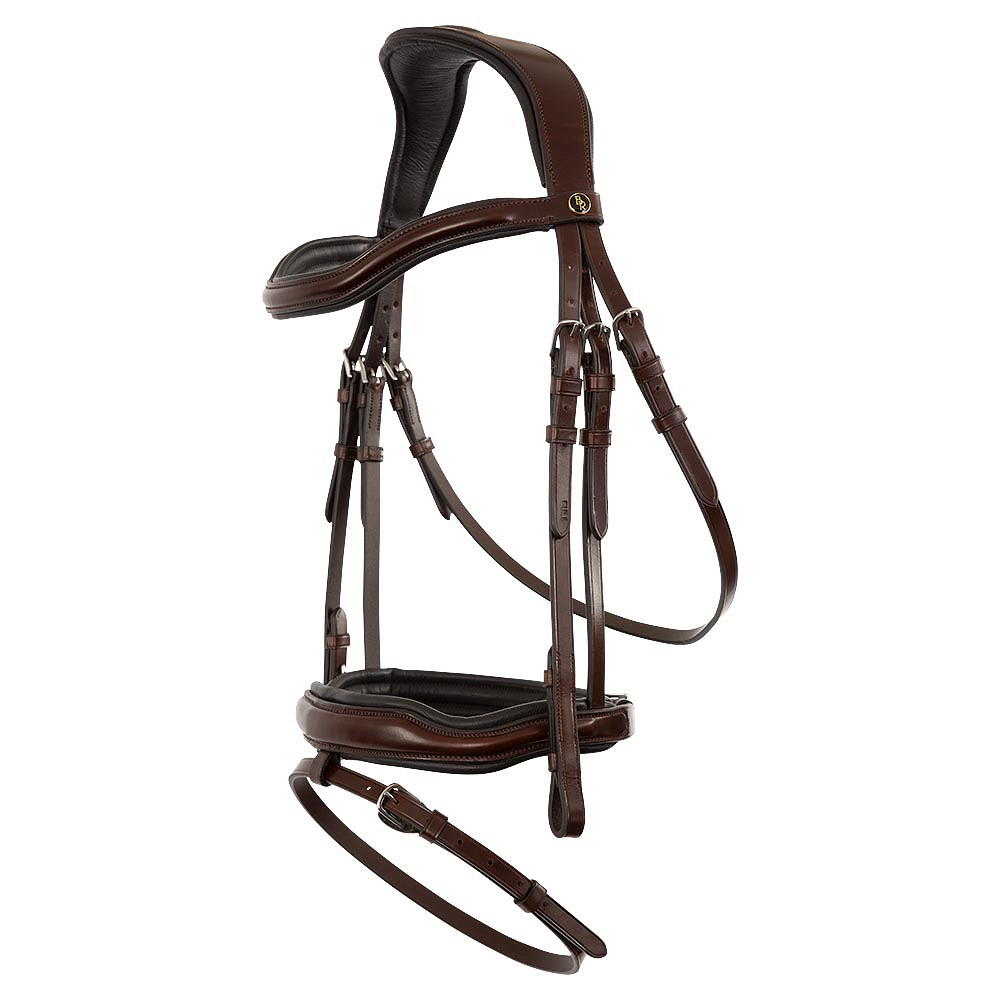BR Bridle Luton, esta brida de forma anatómica proporciona una pieza de cabeza anatómica suavemente acolchada y una muserola anatómica flash. El casco tipo K “Anatomic Fit” (art. 189048) tiene forma anatómica y está suavemente acolchado. Esto garantiza un buen ajuste, una mejor distribución de la presión en la cabeza del caballo y mucha comodidad. La muserola flash de forma anatómica tiene un ancho de 330 mm hasta 20 mm en los laterales. La muserola también proporciona un acolchado suave para una comodidad óptima. La correa del flash es desmontable gracias al accesorio de flash en forma de T. La brida está hecha de cuero inglés de alta calidad, que es flexible, duradero y se adapta bien. El mejor producto ecuestre de competición en tienda hípica El Estribo Alicante +34648425534