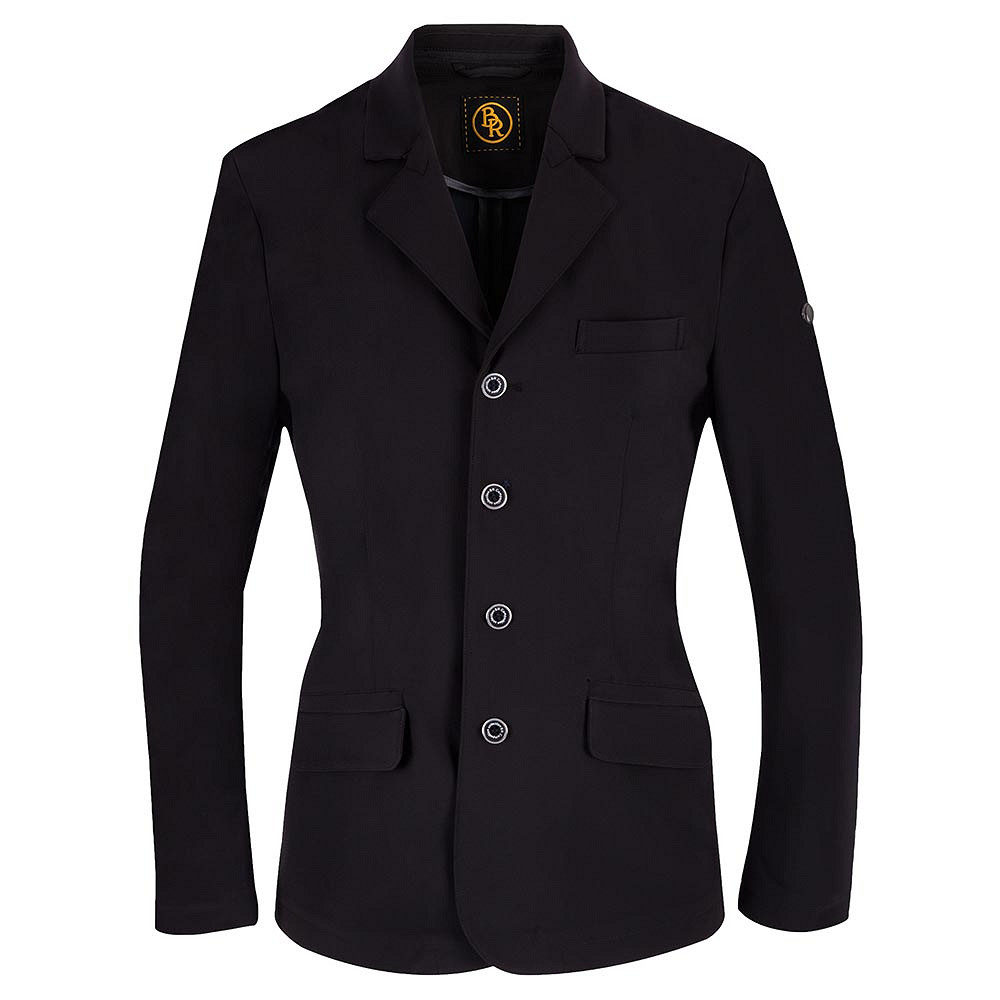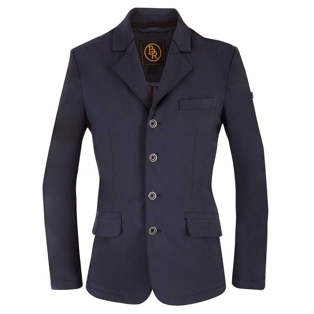 BR Competition Jacket Madrid Men, Elegante chaqueta de competición para hombre fabricada en soft shell. Este material regula la humedad y repele el agua. El material ligero y elástico y las mangas preformadas proporcionan una sensación muy cómoda. La chaqueta cuenta con un bolsillo en el pecho y cuatro botones BR sintéticos en la parte delantera. Los puños se han equipado con botones similares en un tamaño más pequeño. La chaqueta presenta dos aberturas en la espalda. El cuello intercambiable y los bolsillos con solapa hacen que esta chaqueta sea única. Con sistema de fácil cierre y cremalleras ocultas. Lavable a máquina a 30°C. El mejor producto ecuestre de competición en tienda hípica El Estribo Alicante +34648425534