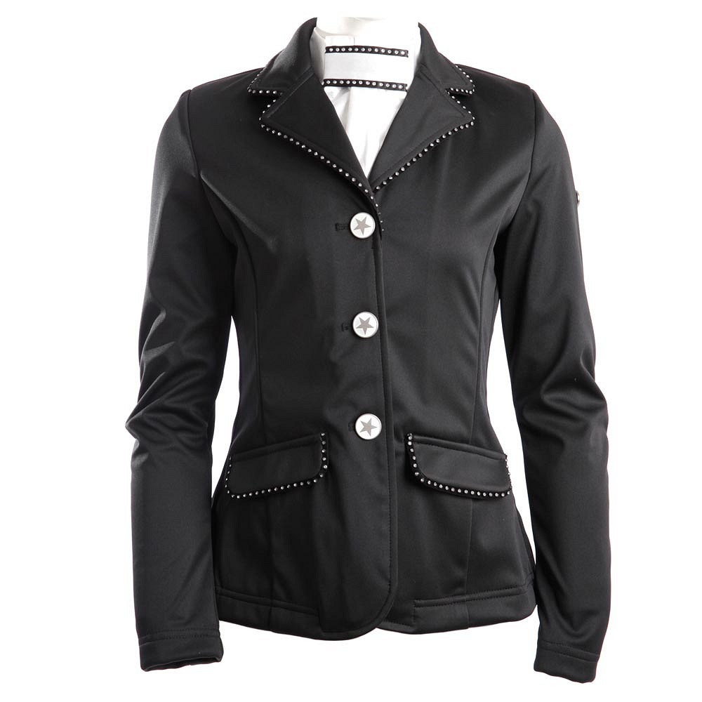 BR JUNDA DE COMPETICIÓN NEW YORK Niños, elegante chaqueta de competencia ajustada, equipada con dos ranuras en la parte posterior. La chaqueta presenta un cómodo material de estiramiento y ha sido equipado con una tubería sutil con diamantes de imitación en el collar y la solapa. Los aletas en los bolsillos en la parte delantera se han equipado con la misma tubería con diamantes de imitación. Las mangas tienen un ajuste cómodo con espacio extra en el codo, lo que mejora la comodidad al viajar. La chaqueta de competencia ha sido equipada con botones de diseño de estrellas. Se proporcionan tres botones adicionales, Matt Silver con cabeza de caballos. Materiales: 100% poliéster, concha blanda.