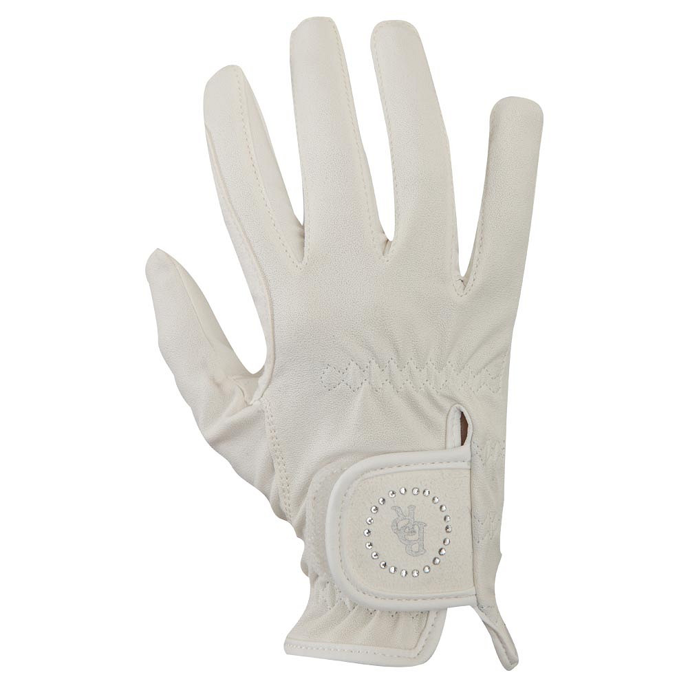 BR guantes drogheda, guantes de competencia blanca hechos de cuero sintético flexible. Los guantes son delgados, transpirables y se ajustan bien alrededor de la mano debido a la muñeca elástica y la parte posterior de la mano. Los guantes cuentan con refuerzos de reingreso y cierres de velcro ajustables decorados con diamantes de imitación. Instrucciones y garantía de lavado: los guantes son lavables a la máquina a 30º. No use suavizante de telas. Cierre el velcro antes de lavar y/o use una bolsa de lavandería separada. Secia los guantes húmedos plano o cuélguelos en un área ventilada. No los sece en la secadora. La garantía de los guantes es de 1 año y se aplica a los errores de material, costura y fábrica. Los rastros de desgaste no están cubiertos por la garantía. Especialmente el uso de riendas antideslizantes ásperas, cuerdas halter y líneas de lámites asegura una vida útil más corta.
