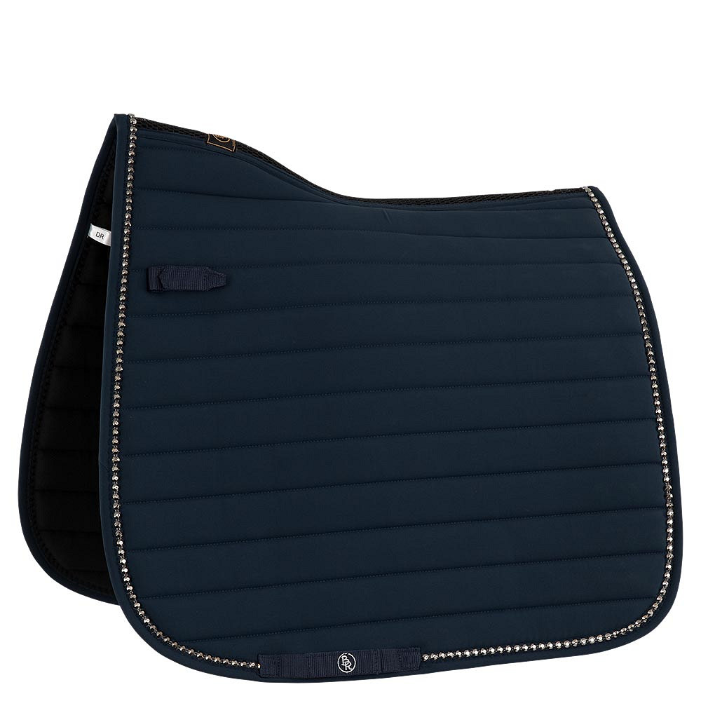 Mantilla BR Ivory Coast C-Wear Dressage, esta elegante mantilla de competición con forma anatómica tiene un forro de poliéster que absorbe la humedad y una costura trasera para promover el flujo de aire. La mantilla tiene un relleno que absorbe los golpes y está decorada con elegantes tachuelas. Cuenta con trabillas y correas de retención con cierres de velcro. Gorro a juego Costa de Marfil, art. 374100. El mejor producto ecuestre de competición en tienda hípica El Estribo Alicante +34648425534