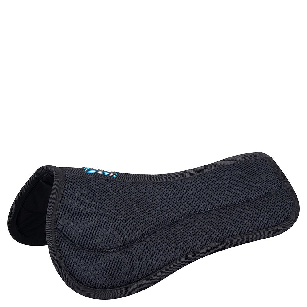 BR Half Pad Pressurelizer Br pressurelizer de media almohadilla, esta media almohadilla anatómica de forma anatómica está hecha de fibra de poliéster tejida tridimensionalmente. Este material innovador también se utiliza en el campo de la ingeniería aeroespacial. Su estructura de fibra única permite una distribución de presión muy uniforme de la silla y el jinete en la espalda del caballo. Esto reduce el riesgo de presión sobre la columna y se marchita. El revestimiento flexible hecho de poliéster de punto sigue sin esfuerzo los movimientos de la estructura de la fibra. La media almohadilla proporciona una distribución de presión perfecta, excelente absorción de choque y ventilación óptima. La almohadilla encaja debajo de todas las sillas de montar. Lavable a máquina a 30 ° C.
