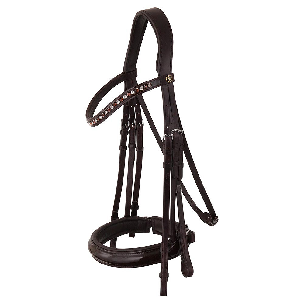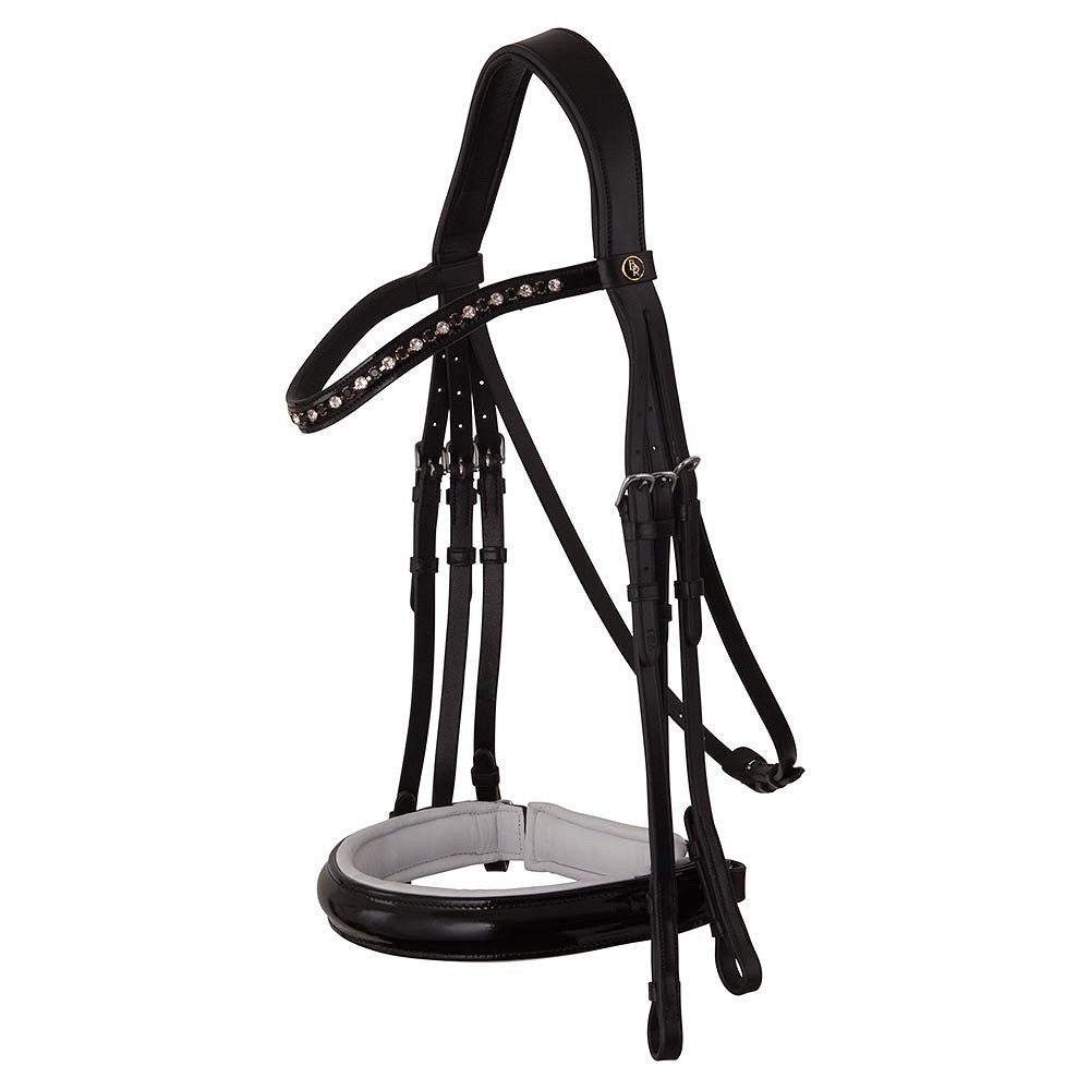 BR Bridle Weymouth Wendover, Brida simétrica con un casco de forma anatómica con suave forro acolchado. La garganta es ajustable con una hebilla en la parte inferior. La frontalera curva con charol tiene incrustaciones de cristales austriacos y un forro de cuero suave. La muserola extra ancha (alrededor de 4,5 cm) con charol tiene un relieve redondo, un forro suave y una amplia almohadilla para la barbilla con un suave forro acolchado. La brida presenta pernos de gancho y hebillas redondas y brillantes de color plateado. Se suministra sin riendas. El mejor producto ecuestre de competición en tienda hípica El Estribo Alicante +34648425534