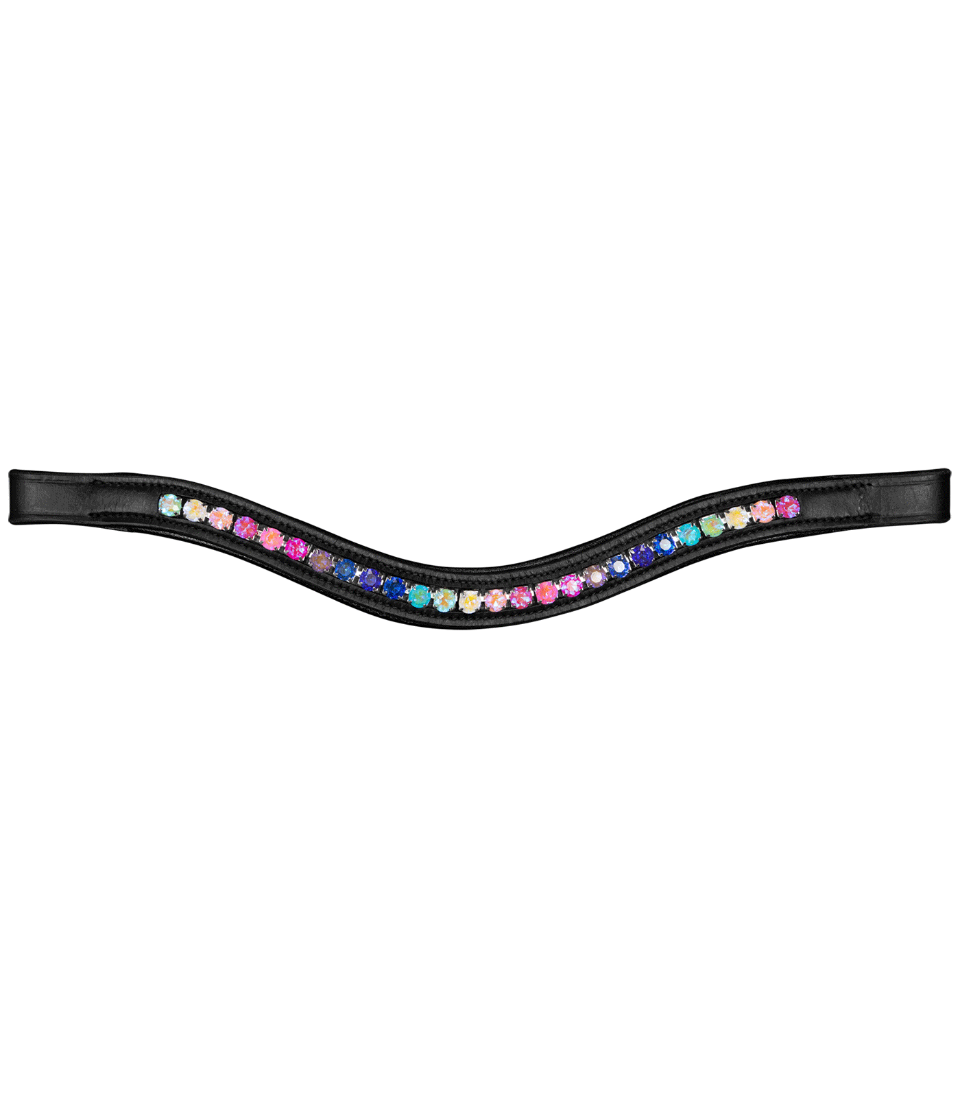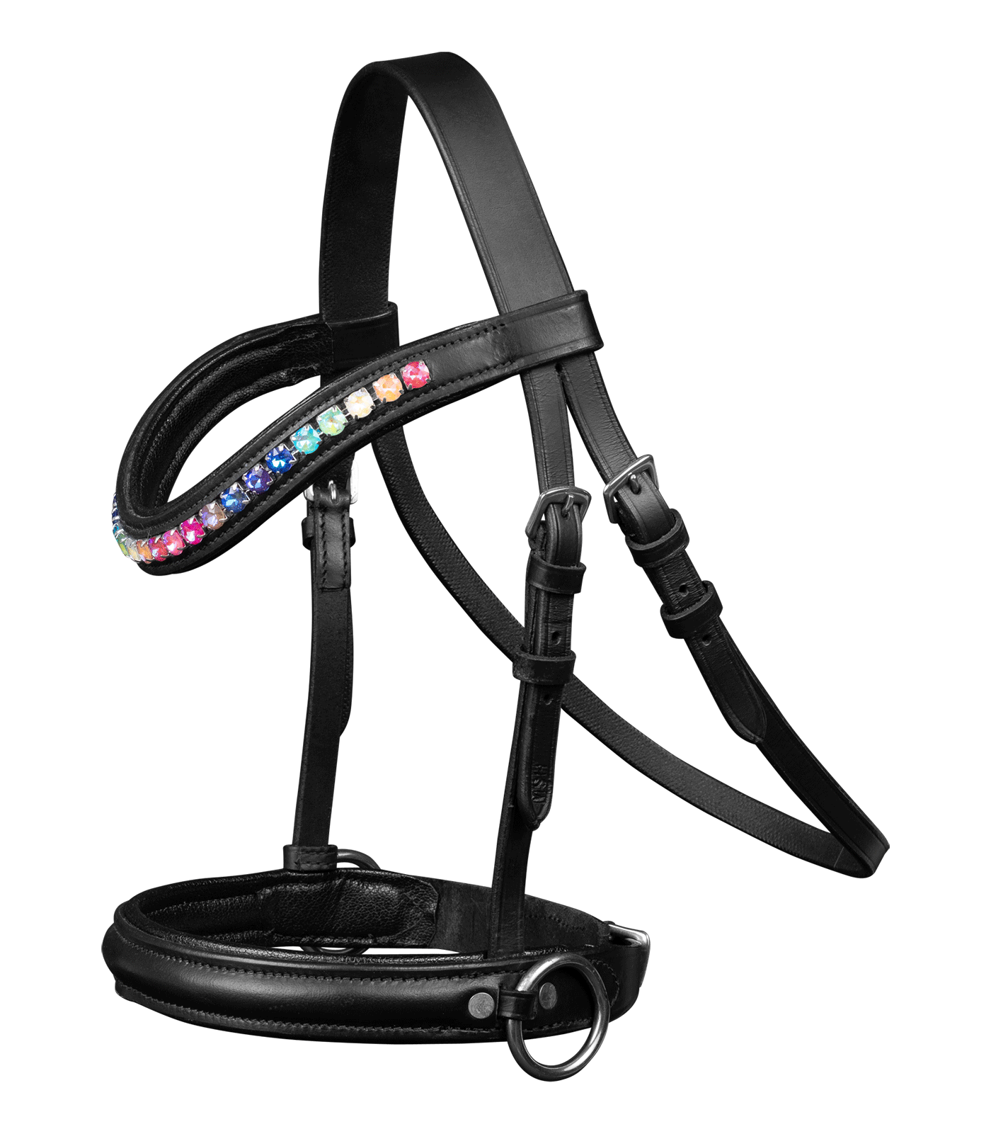 Brida decorativa para caballos de madera con frontalera curvada y decorada con piedrecitas brillantes de colores. Riendas incluidas.