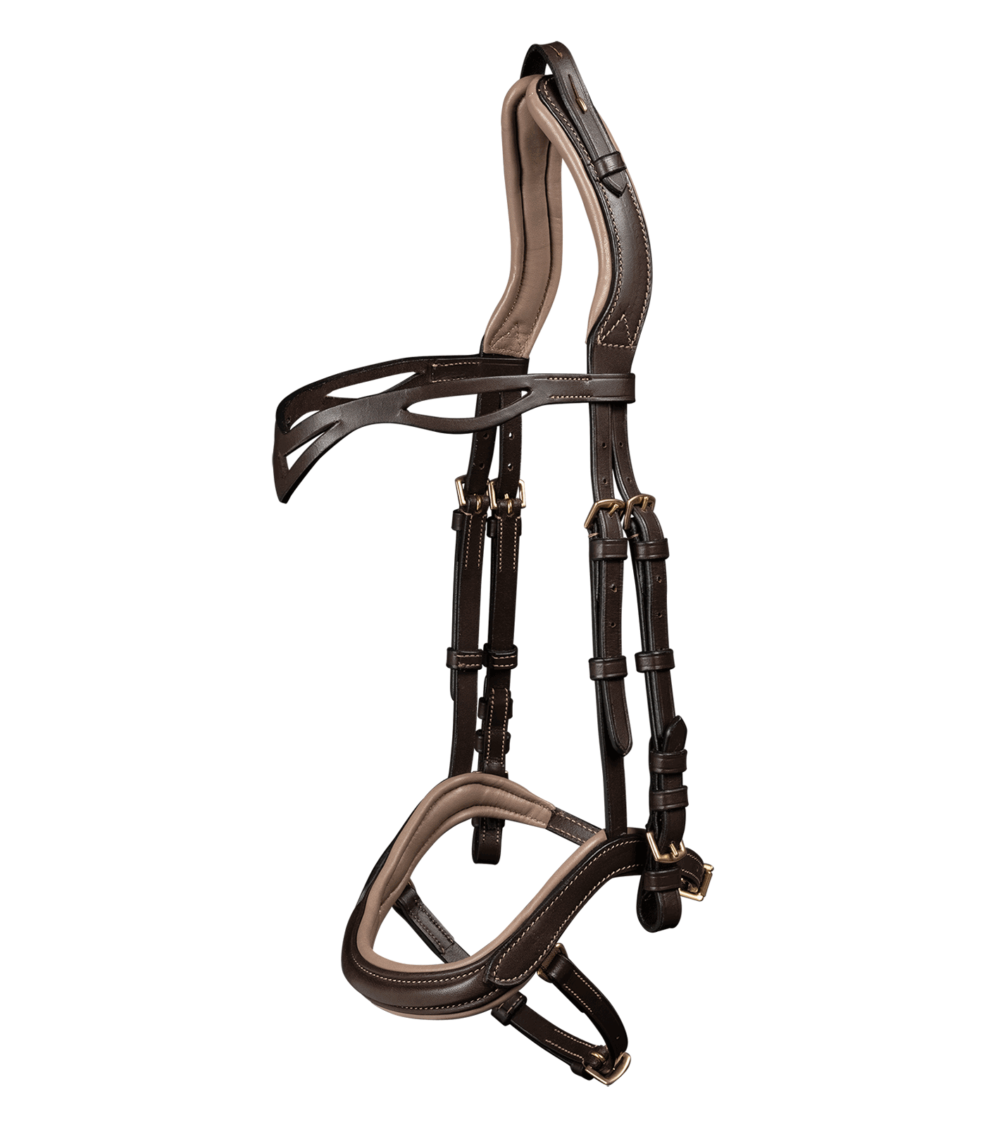 – Testera partida para reducir la presión sobre la cinta de la nuca. – Más libertad de movimiento para las orejas – Forma anatómica de la cabezada para más libertad en el pómulo y en el área de la boca – Muserola y testera con suave acolchado – Frontalera redondeada decorativa – Hebillas de acero inoxidable – En cuero de altísima calidad