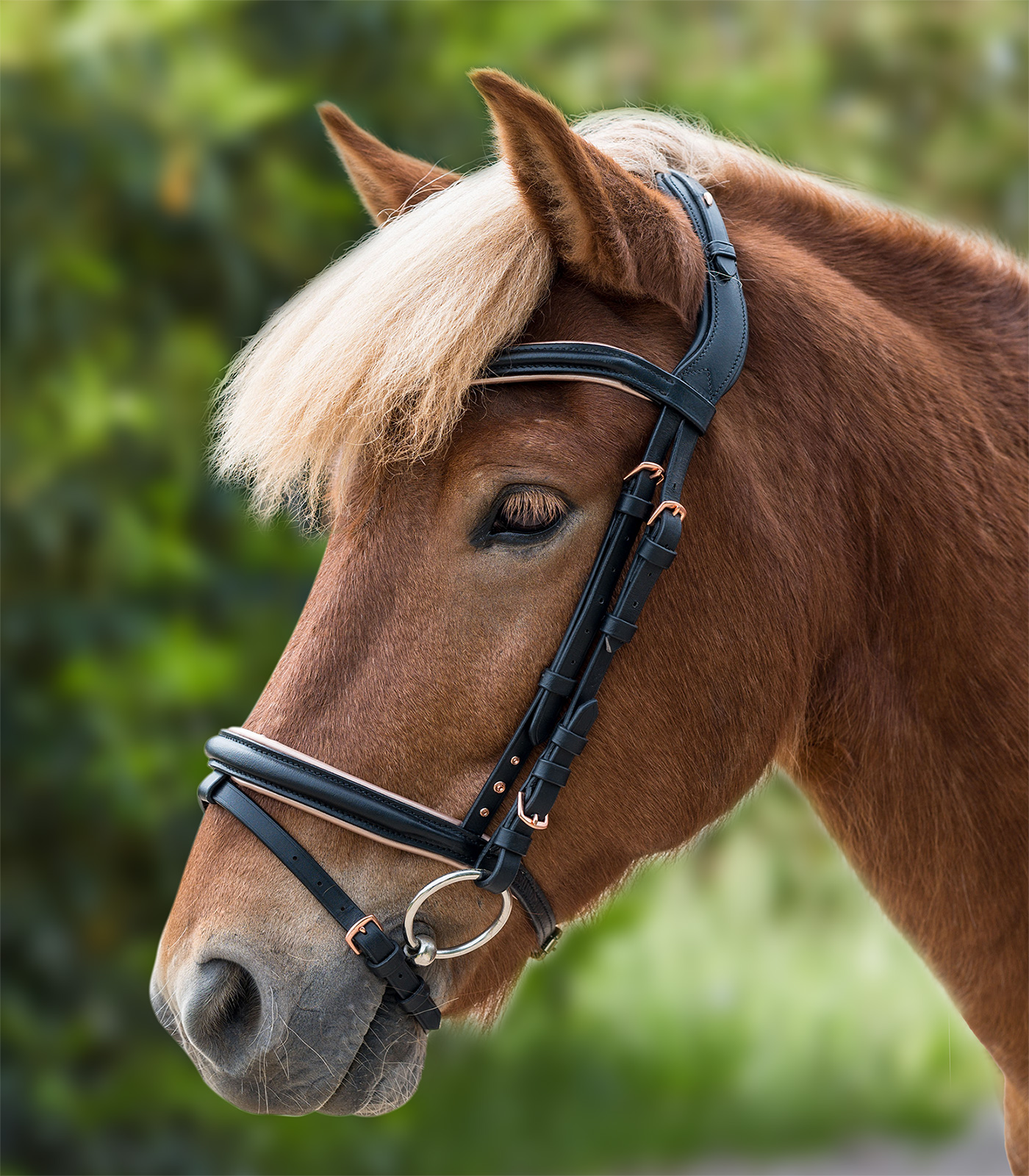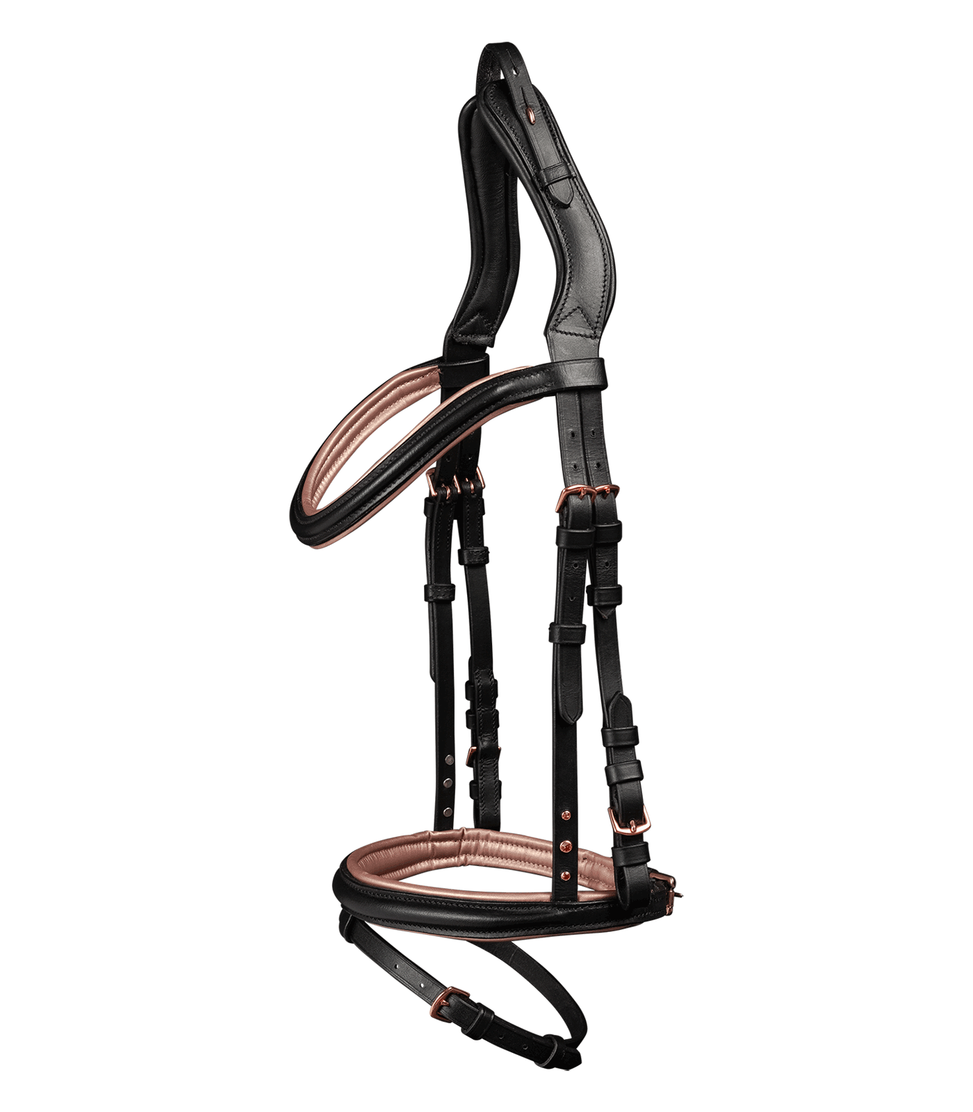 – Testera partida para reducir la presión sobre la cinta de la nuca – Más libertad de movimiento para las orejas – Hebillas en acabado oro rosado – Muserola con suave acolchado en oro rosado – Con 3 piedras estrás en oro rosado en la cabezada – En cuero de altísima calidad