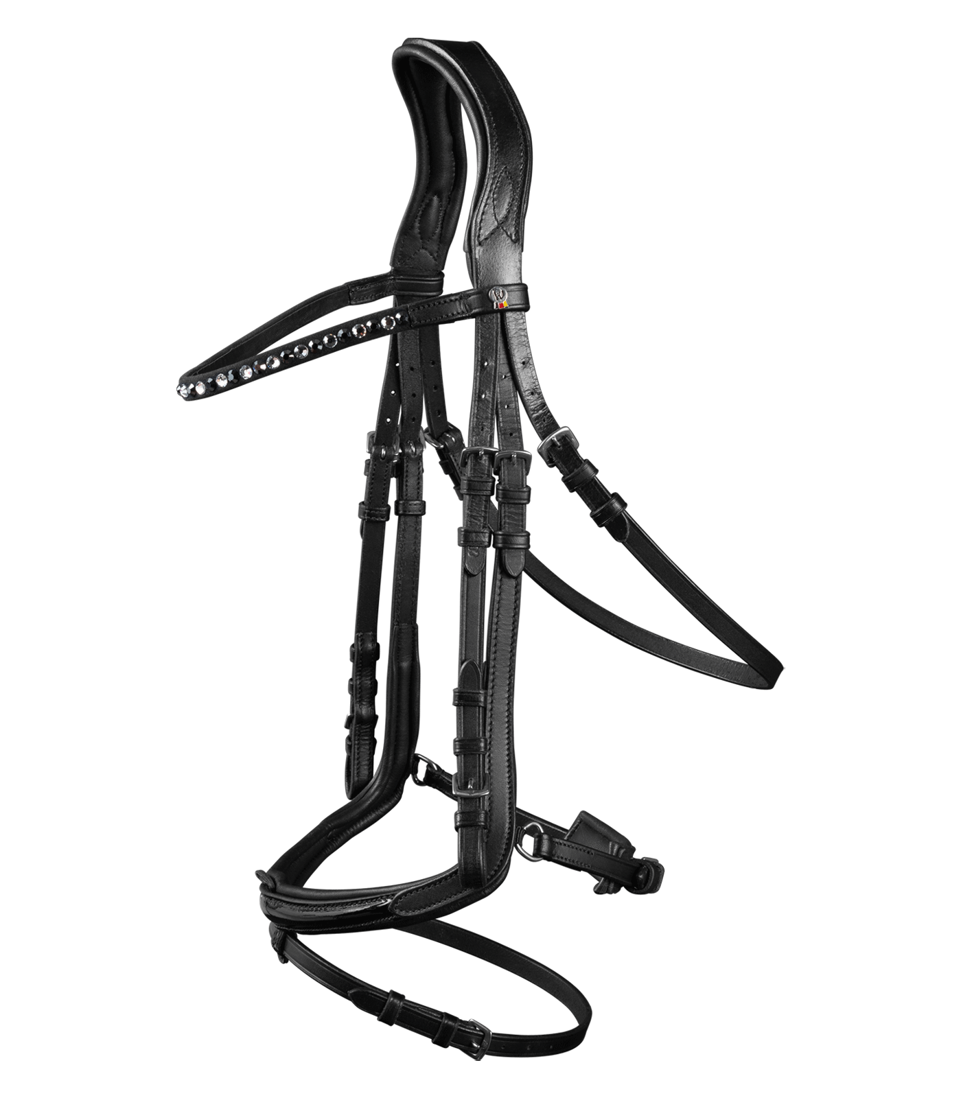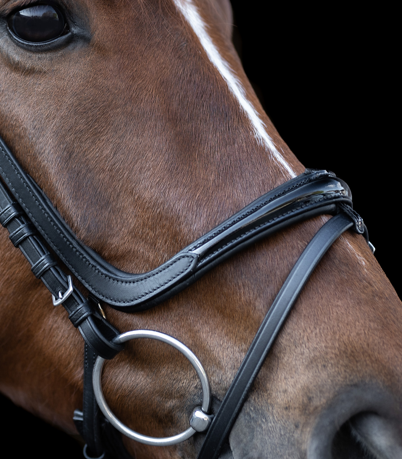 – Cabezada combinada inglesa de montar con acolchado en barbada – Muserola con corte especial curvado para garantizar libertad en la zona del hueso nasal – Testera anatómica – Muserola, frontalera y testera con suave revestimiento acolchado – Hebillas de acero inoxidable – Riendas de tela de 19 mm