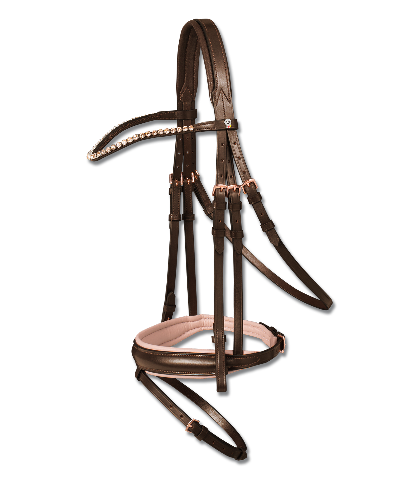 – Cabezada combinada inglesa de montar – Testera derecha con más espacio para las orejas – Frontalera redondeada con cadena de estrás rosado – Muserola y testera con suave revestimiento – Hebillas de acero inoxidable de color rosado – Riendas de tela de 19 mm Colección X-Line de Waldhausen: elegante y de calidad. Más de 185 años de experiencia trabajando el cuero garantizan una calidad excelente y un ajuste perfecto. Nuestros productos de la serie X-Line están realizados con el mejor cuero tratado en las curtiembres de mayor renombre. Bridas Waldhausen ¡para jinetes con un destacado sentido de la calidad!