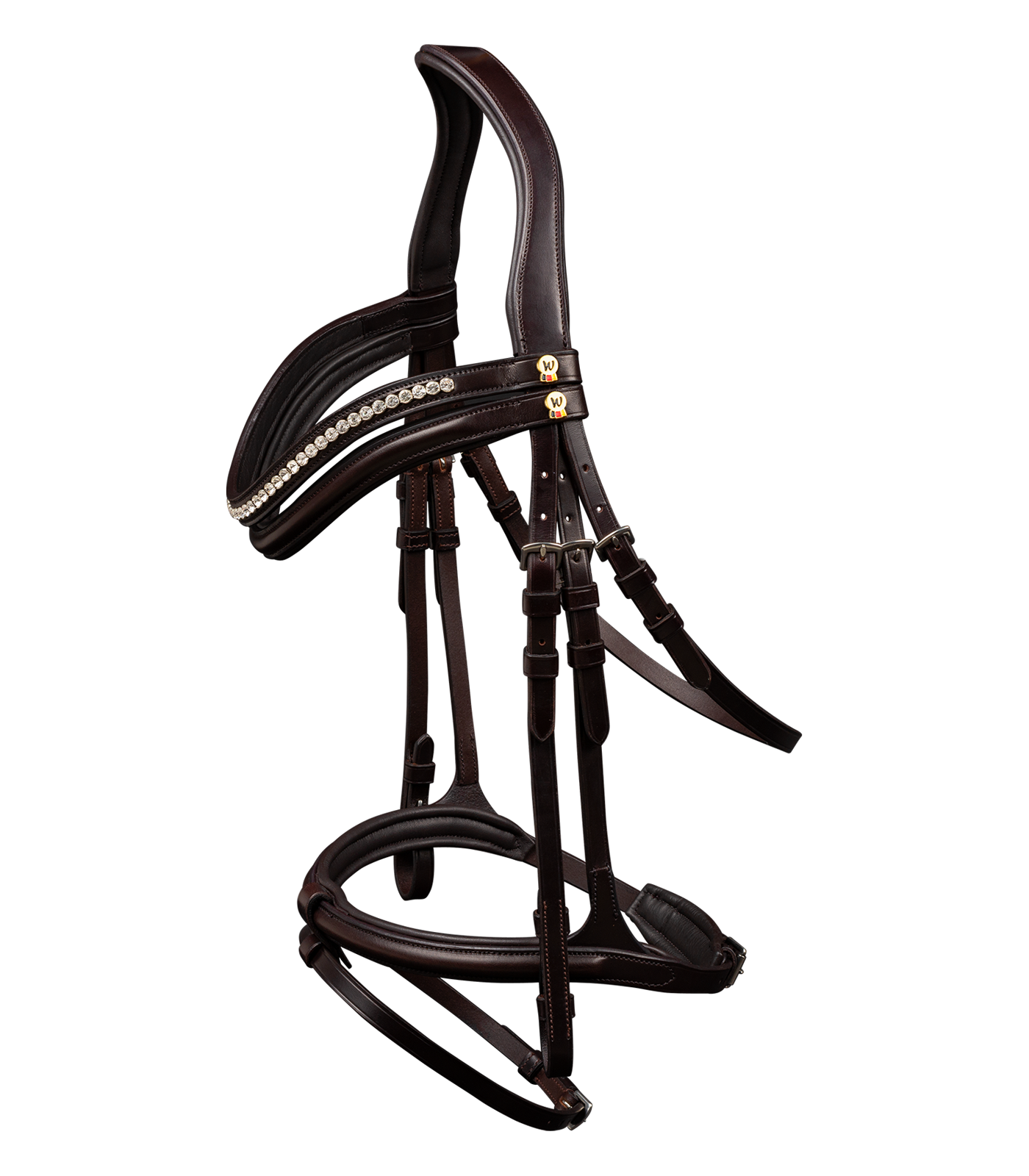 – Cabestro de equitación combinado inglés – Testera anatómica con espacio para las orejas – Correa de trinquete desmontable – Gancho de brida – Equipado con 2 diademas (a elegir entre diadema lisa de cuero y diadema estrecha con cristales) – Muserola y testera con suave acolchado – Herrajes de acero fino – Riendas a juego: 9581.. y 9508 De alta calidad y noble: la colección S-Line de Waldhausen Más de 185 años de experiencia en el tratamiento del cuero garantizan la máxima calidad y un ajuste perfecto. Para nuestra serie S-Line solo se utiliza el mejor cuero europeo, procesado por los artesanos más cualificados. Bridas Waldhausen: ¡para jinetes que aprecian la calidad! Las riendas no se incluyen en el envío.