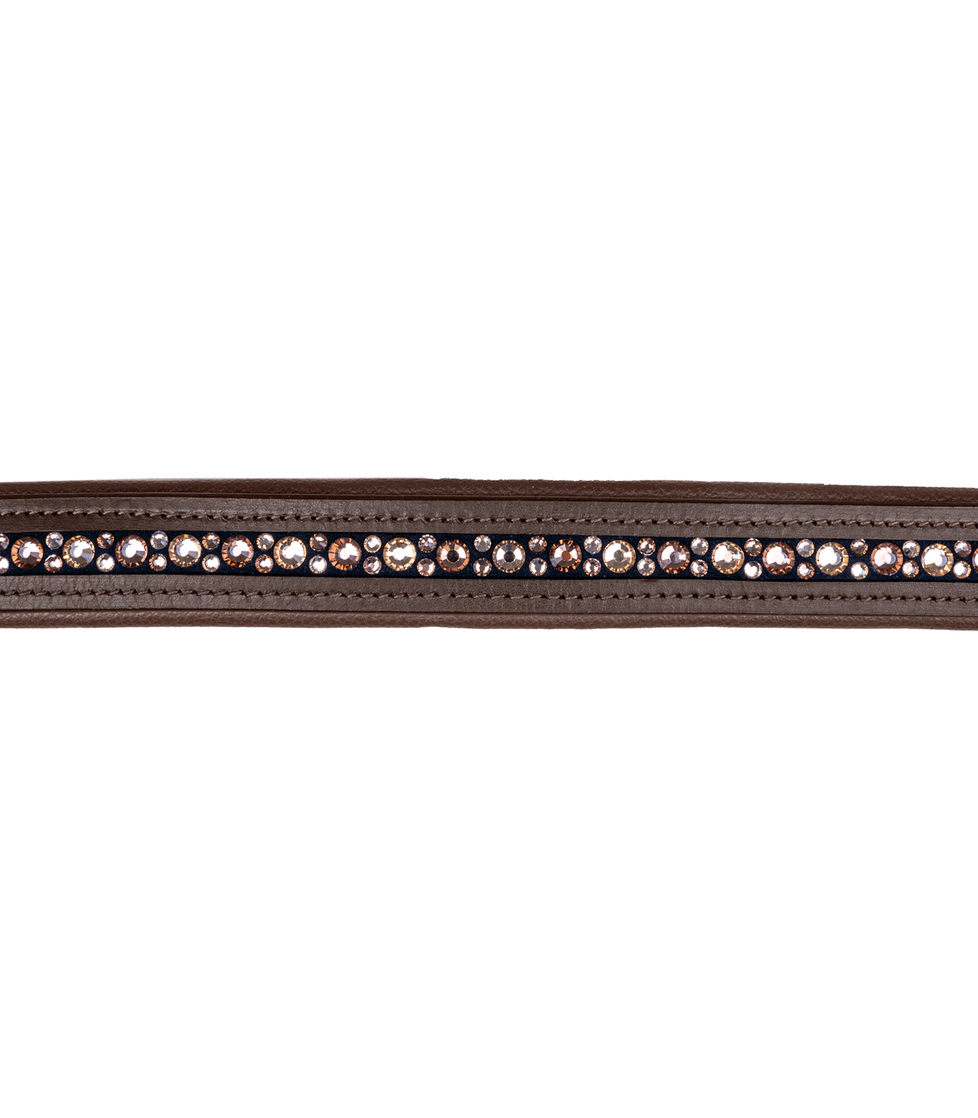 Elegante cabestro de cuero con muserola y testera acolchadas. Con brillantes decorativos en la muserola. Testera ajustable a ambos lados y barboquejo fácil de ajustar. Marrón: herrajes dorados Negro: herrajes gris oscuro