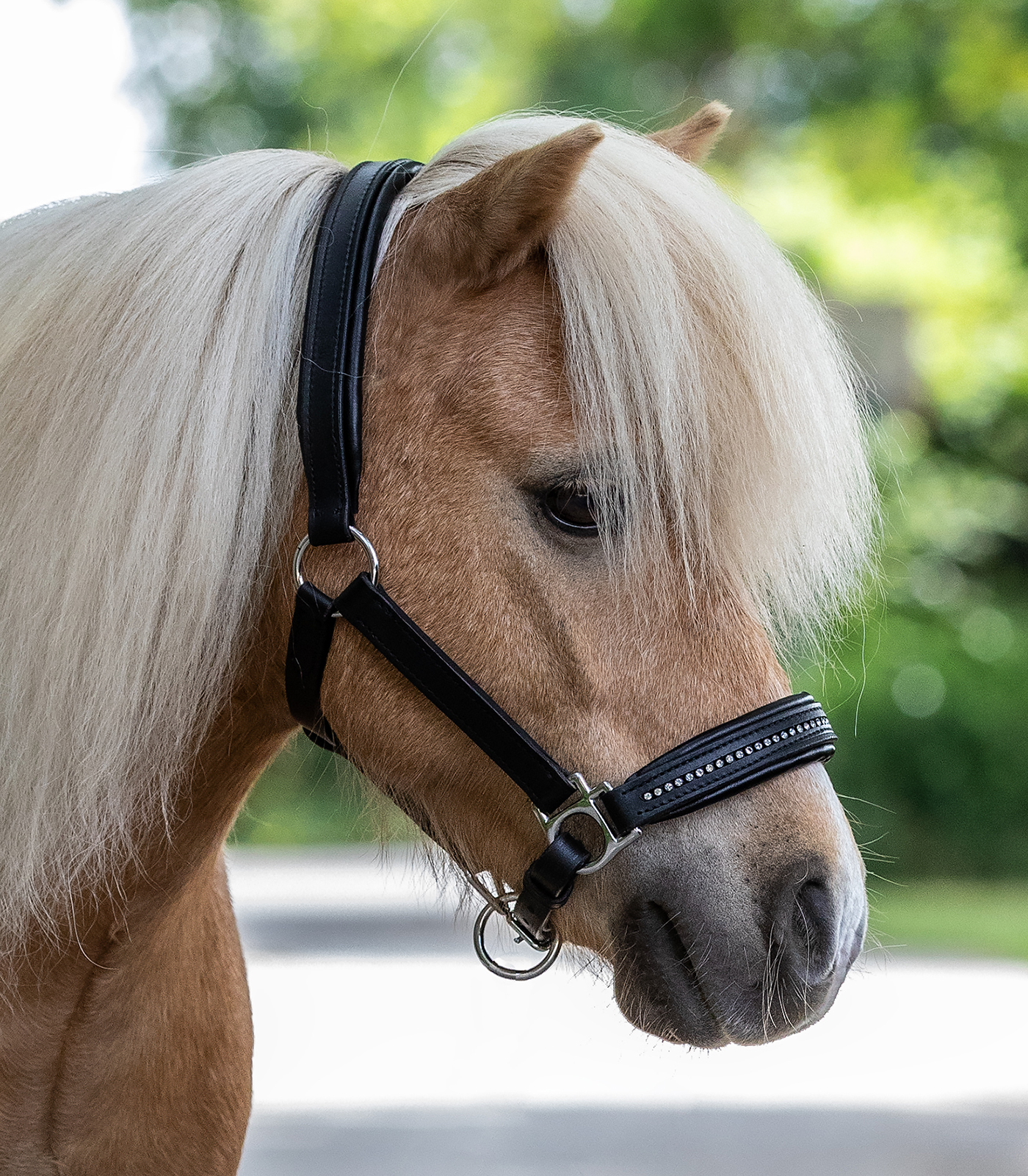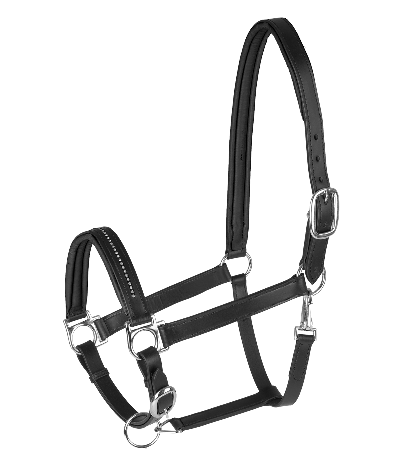 Cabezada de cuero resistente con muserola acolchada de color y testera. Testera y ahogadero ajustables en diferentes posiciones. Hebillas de color plata, de color de latón en el caso de color marrón.