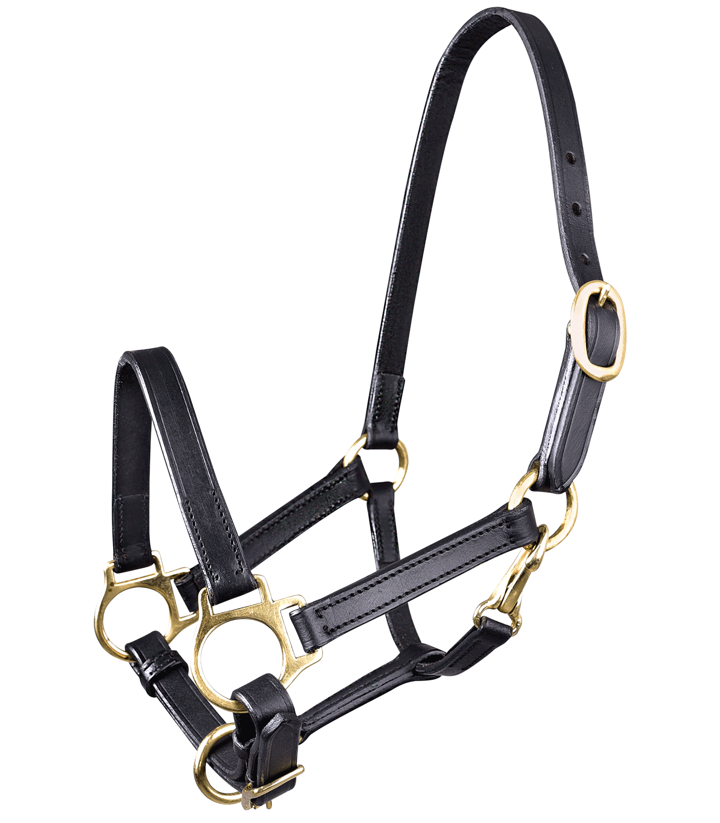 Cabezada para potro resistente y sencilla de cuero con hebillas de latón. Ahogadero y testera ajustables en diferentes posiciones.
