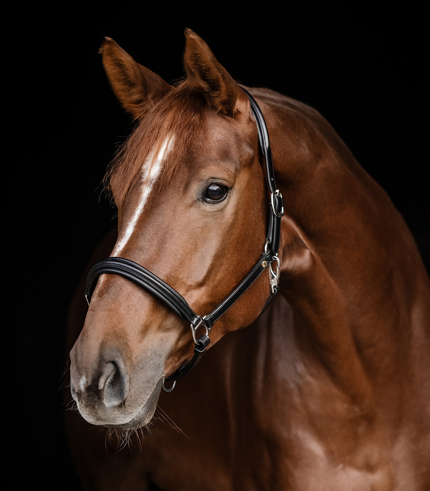 Elegante cabezada de cuero con acolchado muy suave en la testera y en la muserola. Testera regulable en ambos lados y barbada de fácil ajuste.