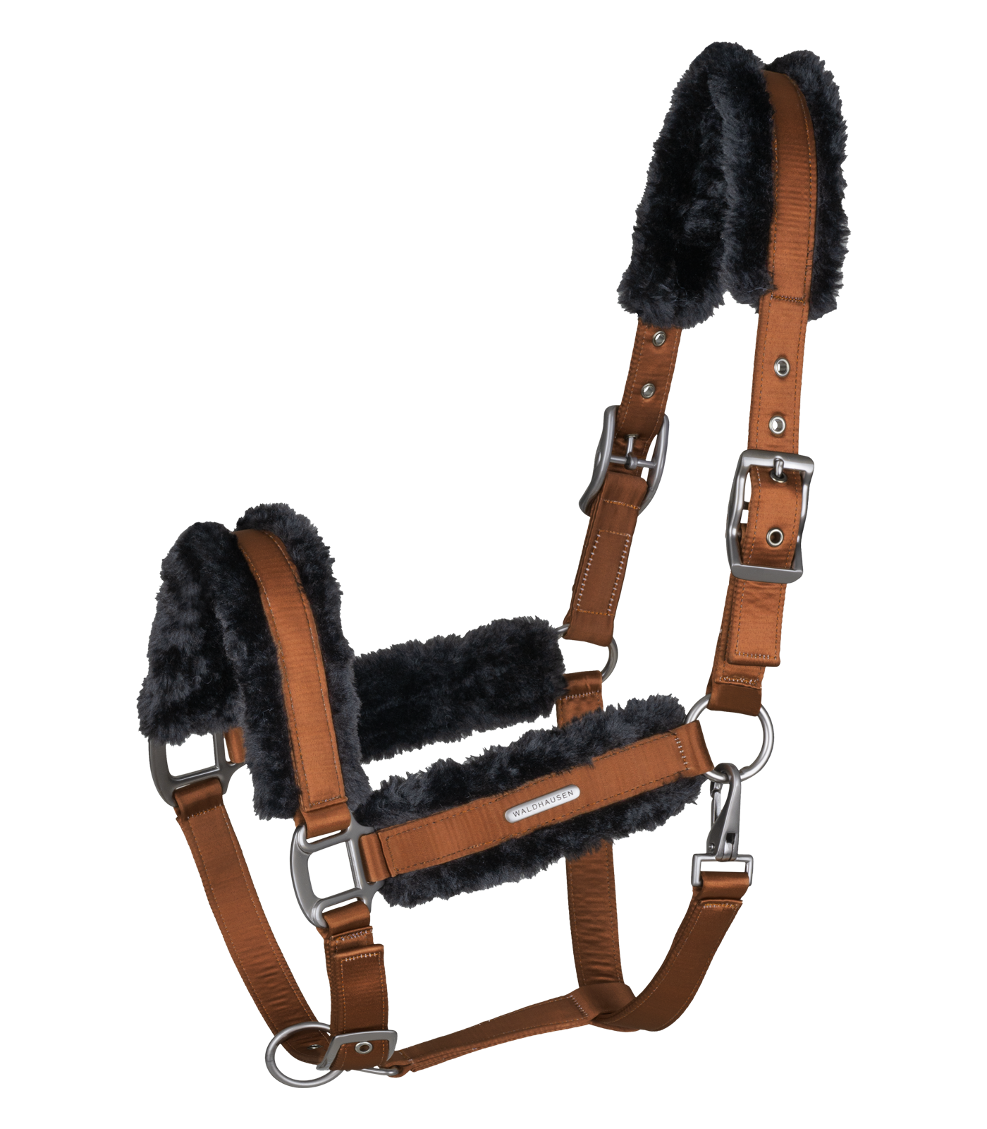 Cabezada de alta calidad con una elegante funda de satén. El cabezal, la muserola y las carrilleras están forrados de pelo sintético, lo que lo hace muy cómodo de llevar. La correa de la barbilla es fácilmente ajustable y el cabezal puede ajustarse a ambos lados. Con herrajes de color oscuro, mosquetón y logotipo plateado de Waldhausen.