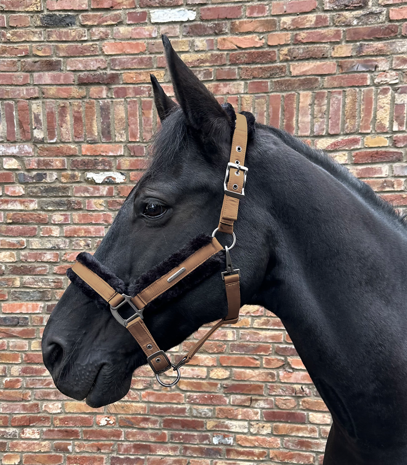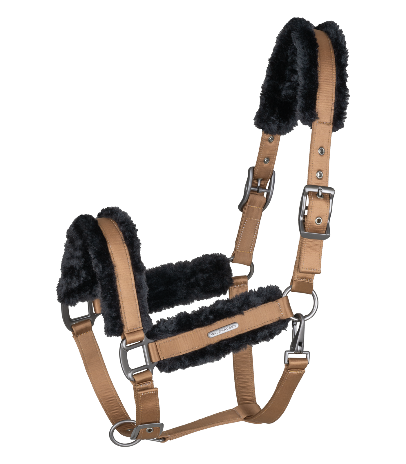 Cabezada de alta calidad con una elegante funda de satén. El cabezal, la muserola y las carrilleras están forrados de pelo sintético, lo que lo hace muy cómodo de llevar. La correa de la barbilla es fácilmente ajustable y el cabezal puede ajustarse a ambos lados. Con herrajes de color oscuro, mosquetón y logotipo plateado de Waldhausen.