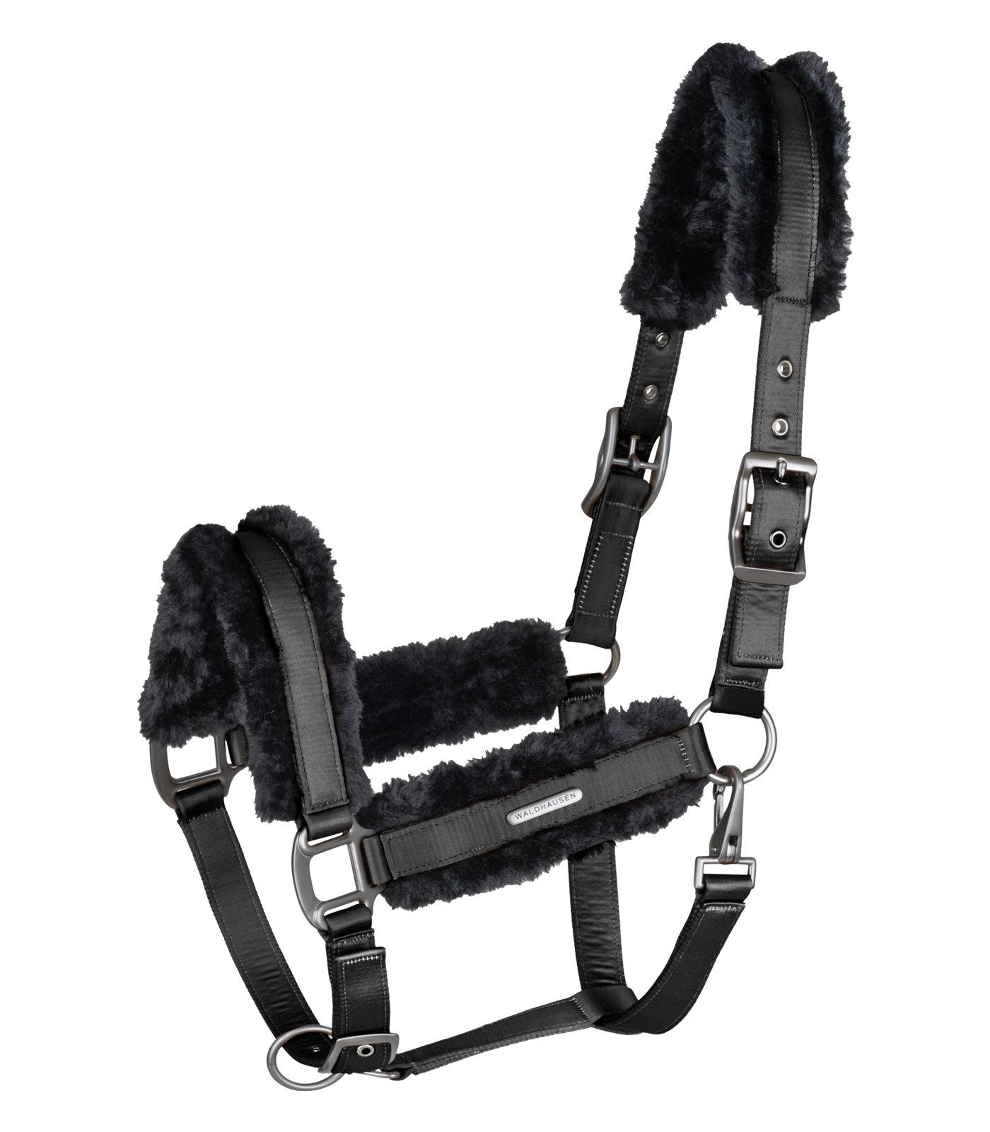 Cabezada de alta calidad con una elegante funda de satén. El cabezal, la muserola y las carrilleras están forrados de pelo sintético, lo que lo hace muy cómodo de llevar. La correa de la barbilla es fácilmente ajustable y el cabezal puede ajustarse a ambos lados. Con herrajes de color oscuro, mosquetón y logotipo plateado de Waldhausen.
