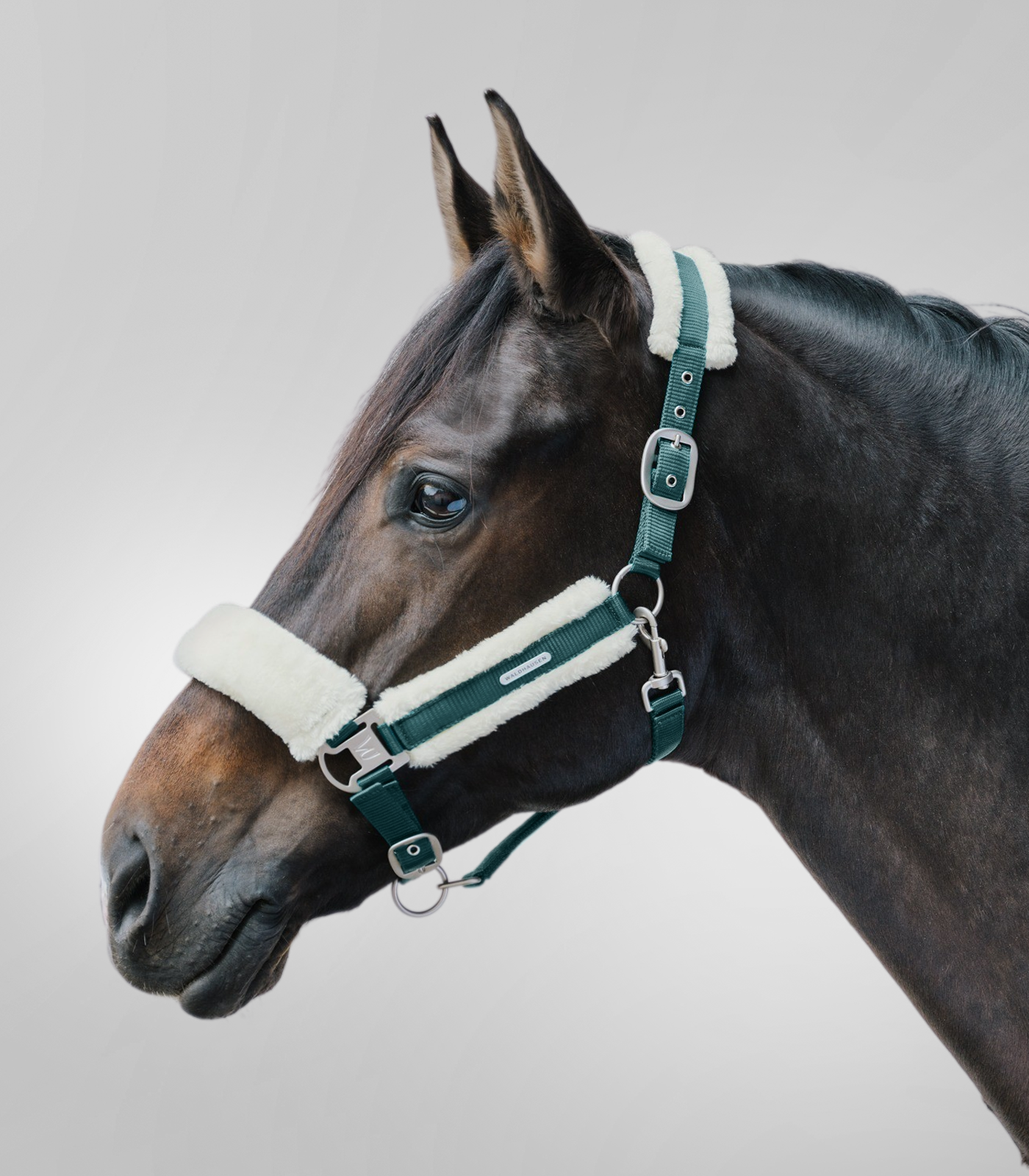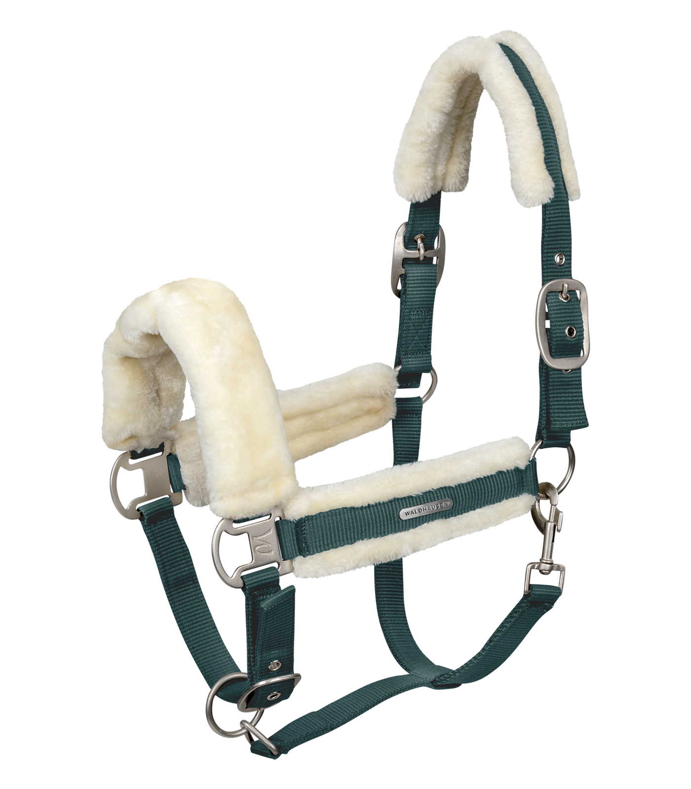 Cabezada de alta calidad con acolchado suave de pelaje sintético en testera, muserola y montantes. Ajustable en ambos lados en la barbada y en la testera. Con hebillas en plata mate y logotipo plateado Waldhausen.