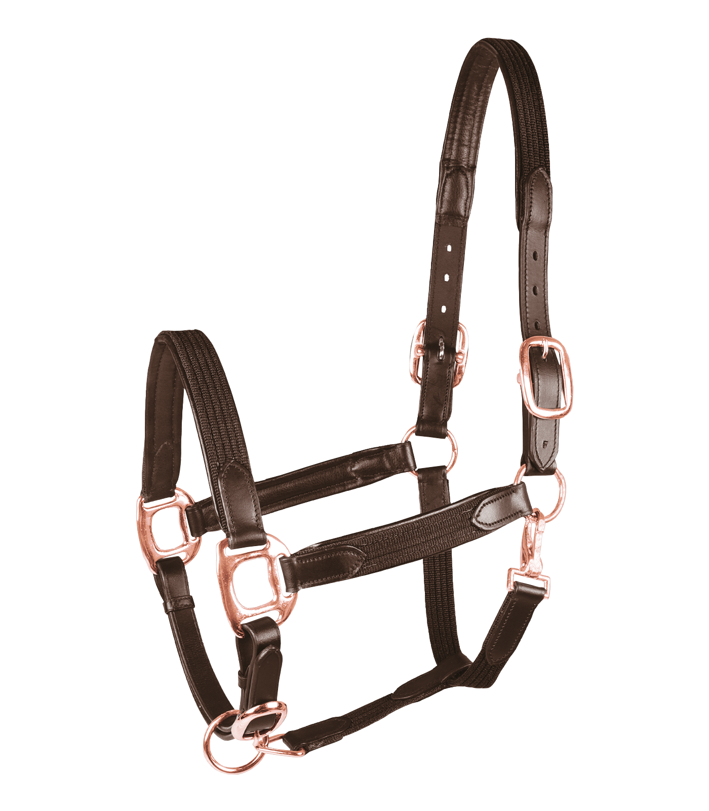 Cabezada resistente de material con efecto Webbing, de cuero auténtico y material sintético. 2 posiciones diferentes de regulación en la testera.