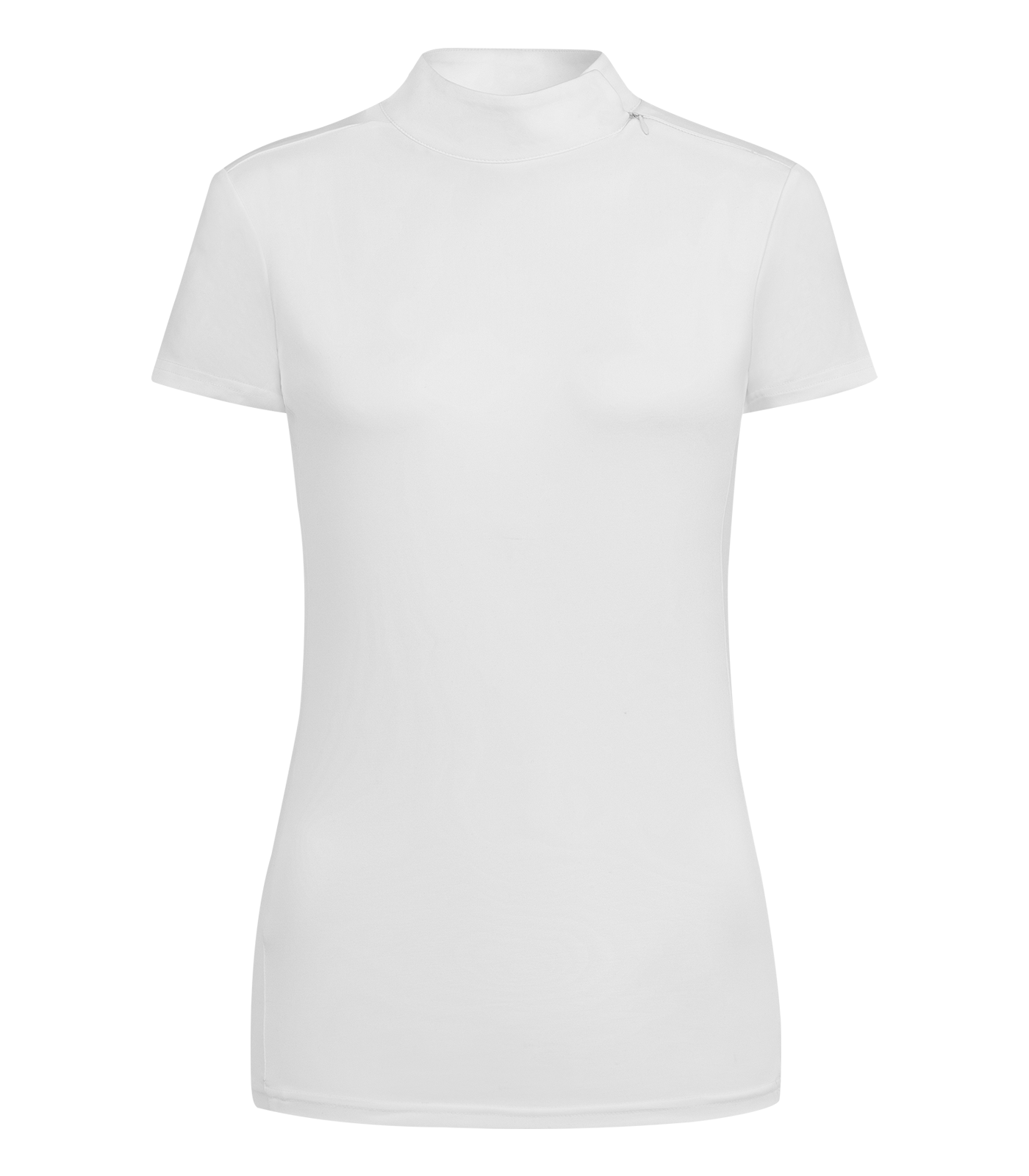 – Camiseta funcional de concurso de diseño deportivo, con discretos detalles brillantes de purpurina – Corte entallado – Cuello reforzado con cierre hecho de botones automáticos invisibles – Cremallera de costura fina en los hombros – Logotipo estampado brillante en color plateado en la parte trasera del cuello Material: 92% poliéster, 8% elastano