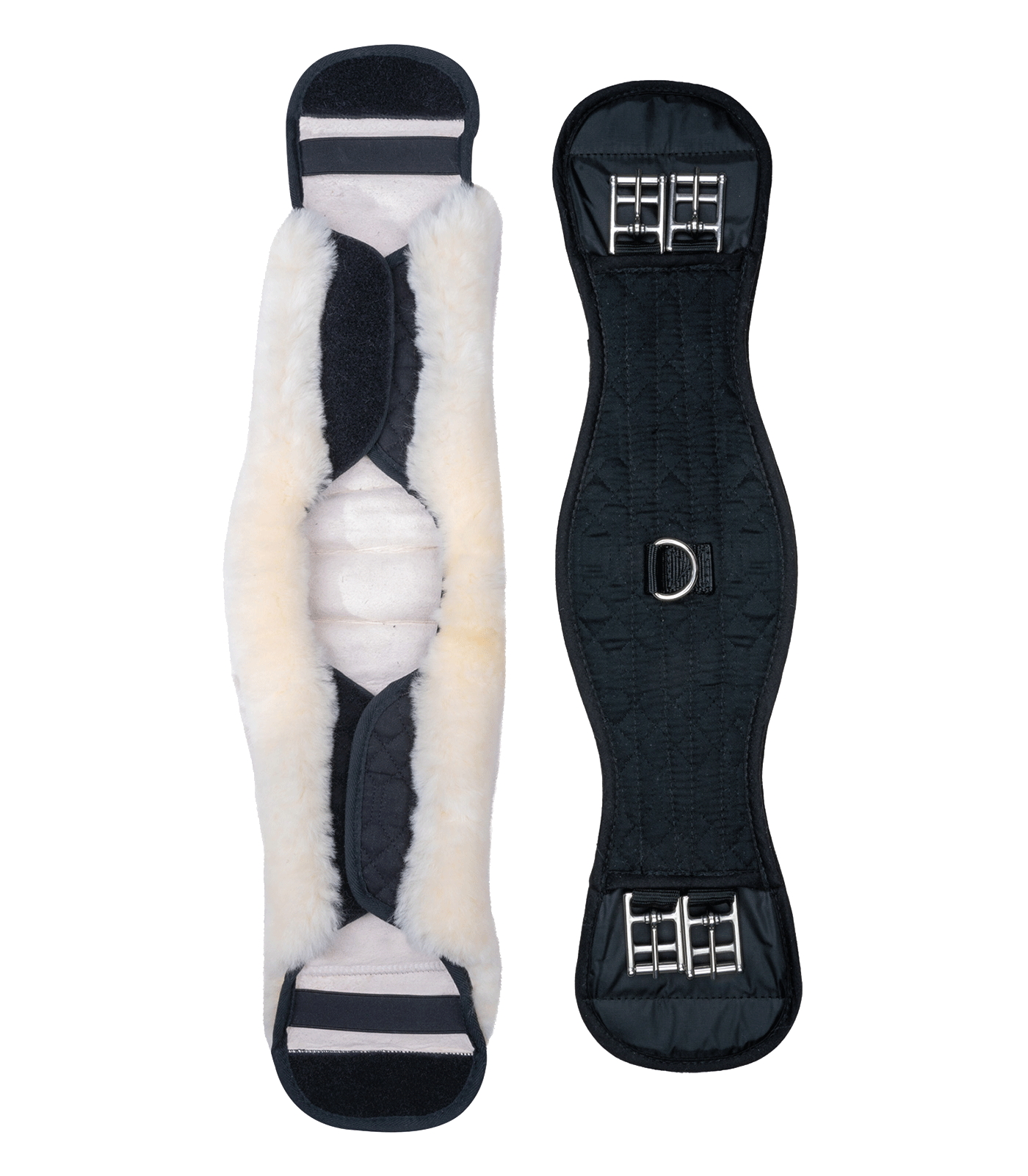 Cincha anatómica de excelente calidad con borreguito auténtico para una protección ideal contra puntos de roce y presión. La funda de borreguito dispone de cierres de gancho y bucle para poderla quitar y lavar con toda comodidad. Con una anilla en D y hebillas de rodillo de acero inoxidable, sin inserción elástica.