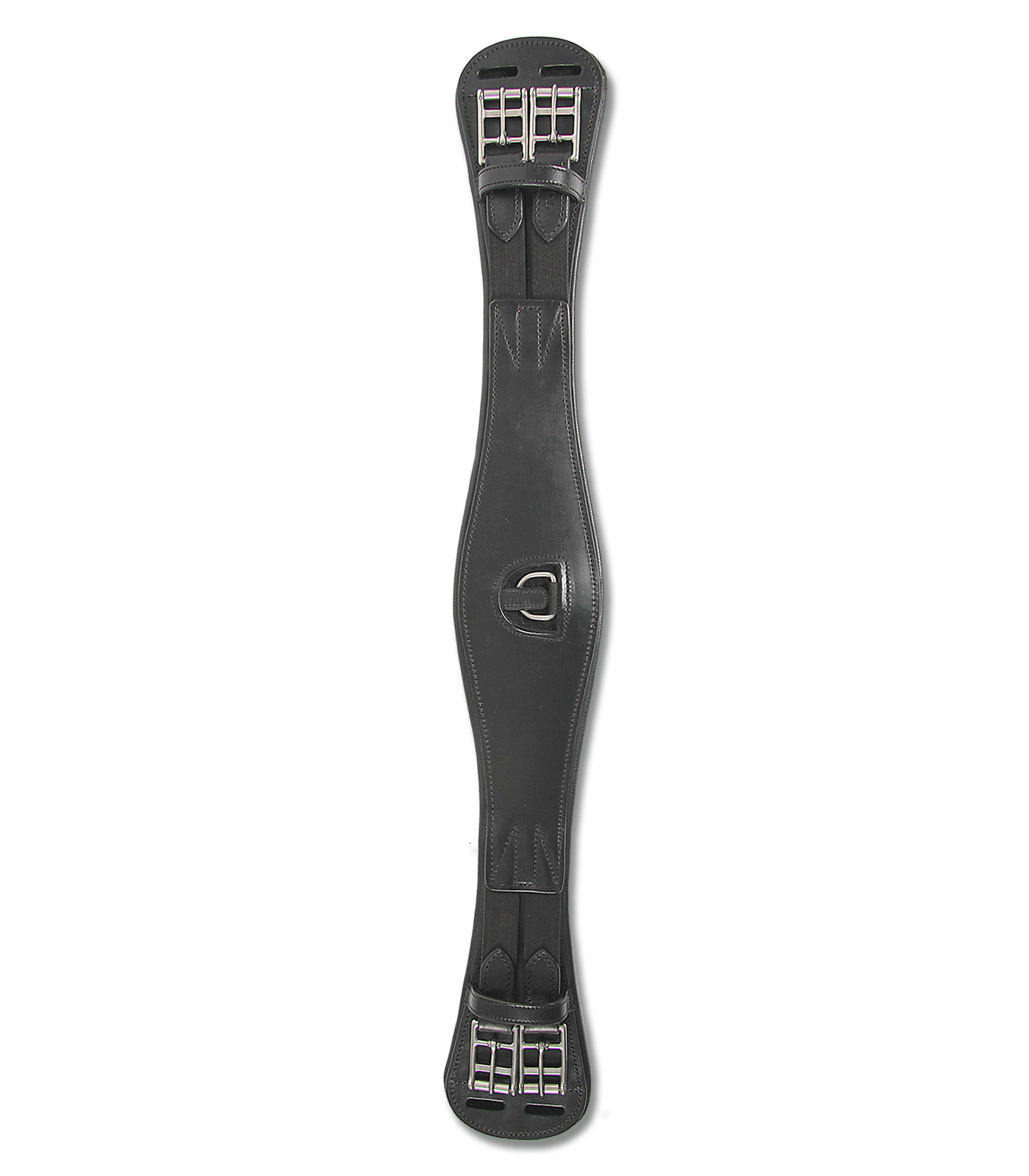 Con suave revestimiento interior y corte anatómico, impide la formación de puntos de roce y se ajusta perfectamente al caballo. Cuero de excelente calidad y hechura. Con hebillas de rodillo de acero inoxidable, inserción elástica en ambos extremos y anilla central para la sujeción de riendas auxiliares. Las aberturas para las correas, realizadas en el cuero, impiden que la cincha se deslice debajo de las mismas correas.