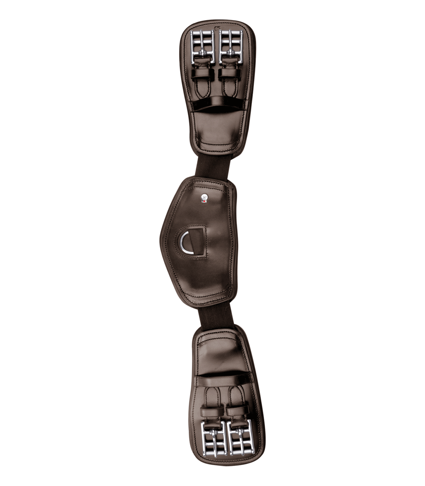 Cincha corta acolchada, anatómica y confeccionada en cuero suave y de alta calidad. Las dos aplicaciones elásticas garantizan una libertad adicional de movimiento al respirar y evitan el roce ajustándose perfectamente al caballo. Extremos de la cincha sin inserción elástica, con hebillas de rodillo de acero inoxidable y anilla en D.