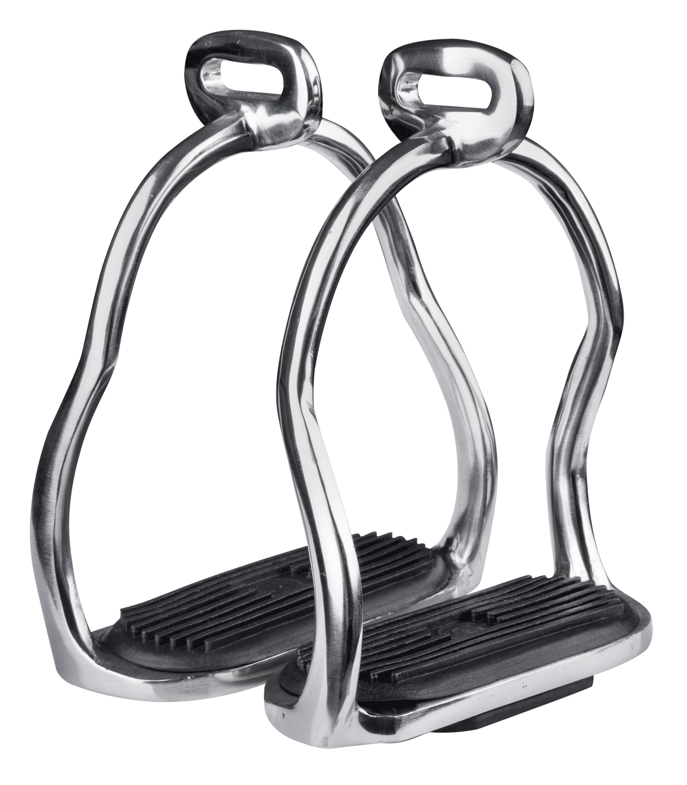 Estribo de acero inoxidable con brazos arqueados y ojal posicionado perpendicularmente (90°). Inserción de goma de color negro. Set de un par. Ancho: 12 cm Peso: 1,240 kg
