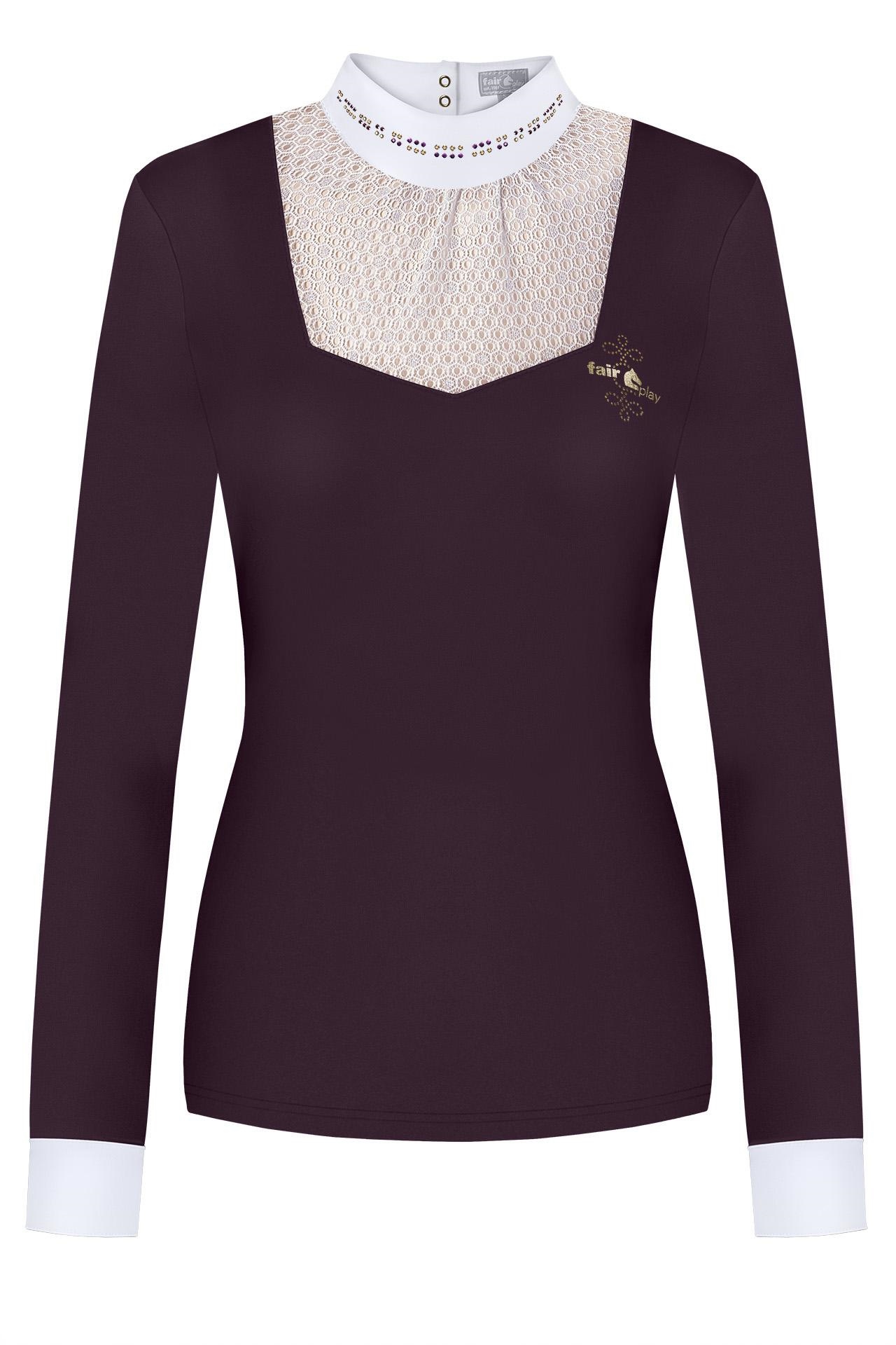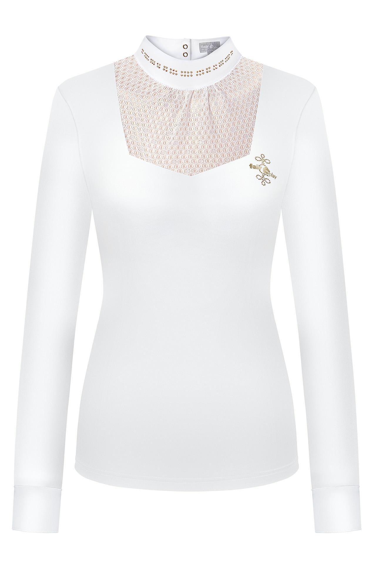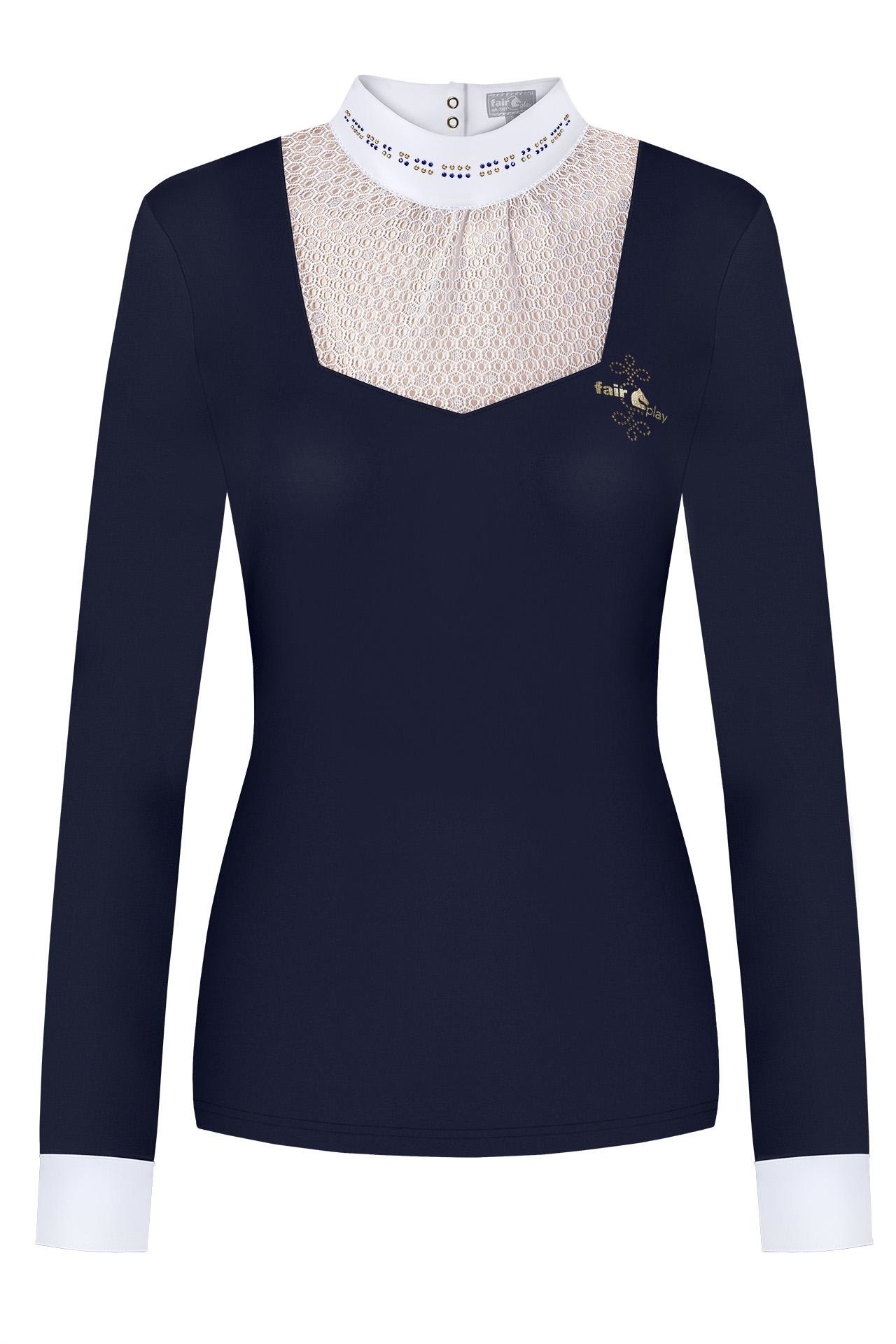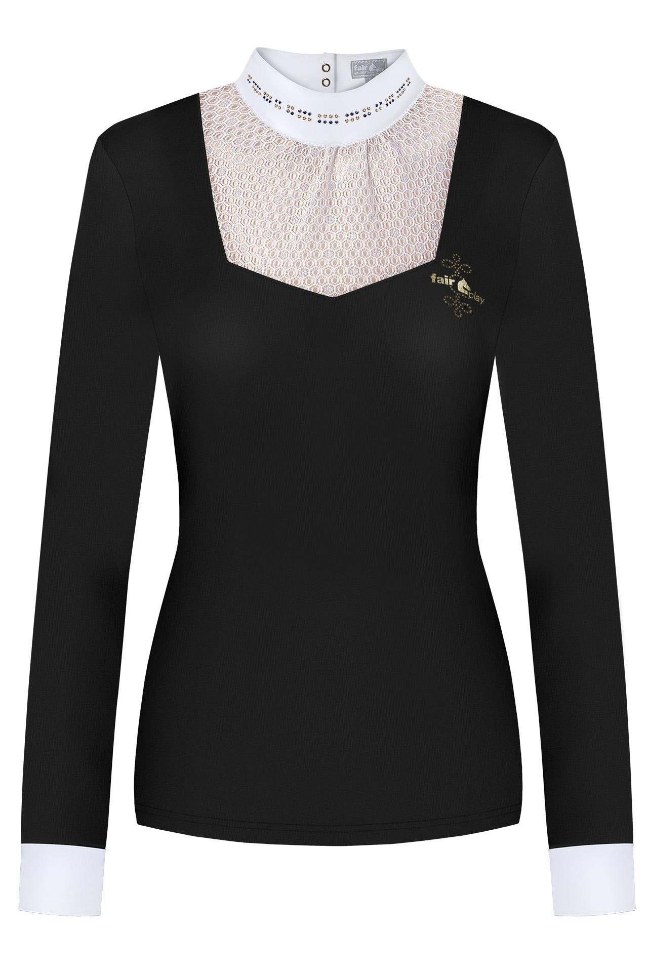 • Camiseta de competición extremadamente linda • Confeccionada con un tejido técnico elástico, transpirable, reciclado y que absorbe la humedad con función UVP • Inserciones decorativas hechas de encaje elástico blanco en la parte delantera y trasera • Cuello alto decorado con cristales dorados vintage, abrochado en la parte trasera con dos botones de presión ocultos • Puños blancos en todos los colores • Logotipo decorativo Fair Play con pedrería en la parte delantera