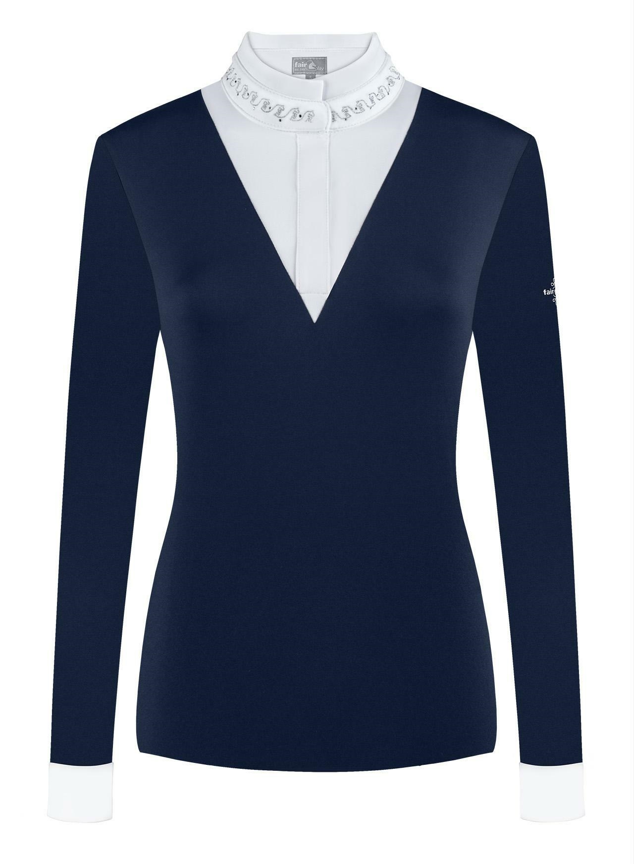 •Camiseta de competición funcional de manga larga •Confeccionada en tejido elástico y transpirable con función UVP 30 •Cierre en la parte delantera con botones automáticos cubiertos •Elegante cuello alto, decorado con un elegante bordado con motivo de caballo y cristales•Cuello alto, escote y puños en blanco.• Logotipo Fair Play en la manga