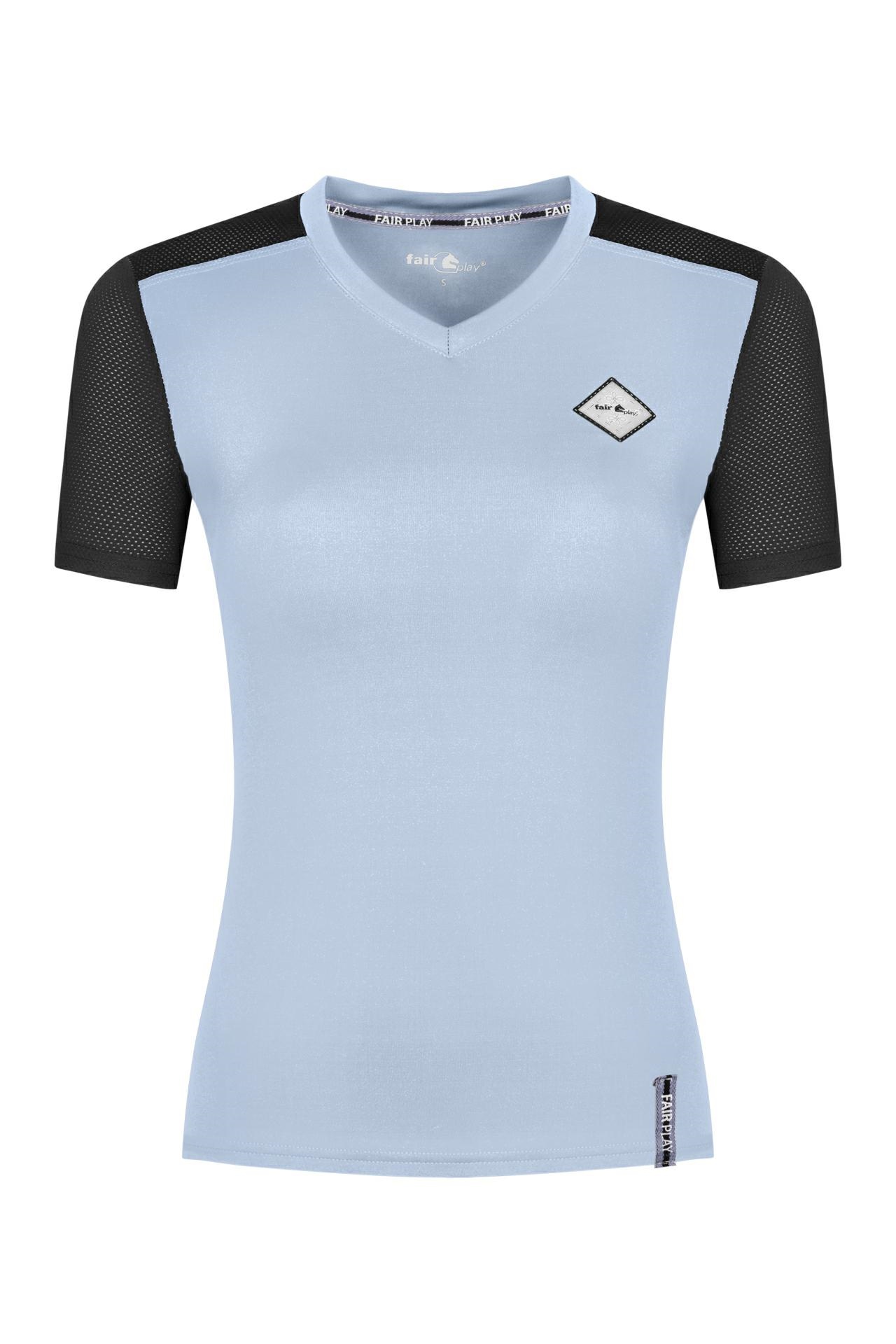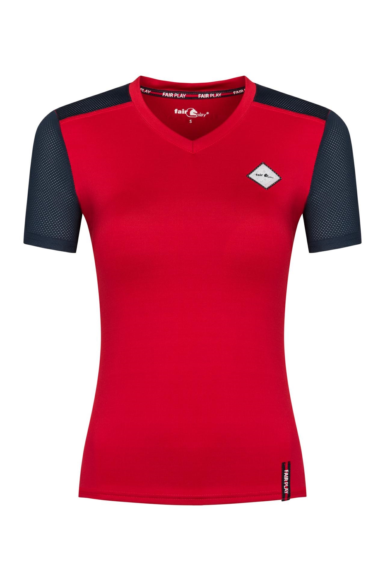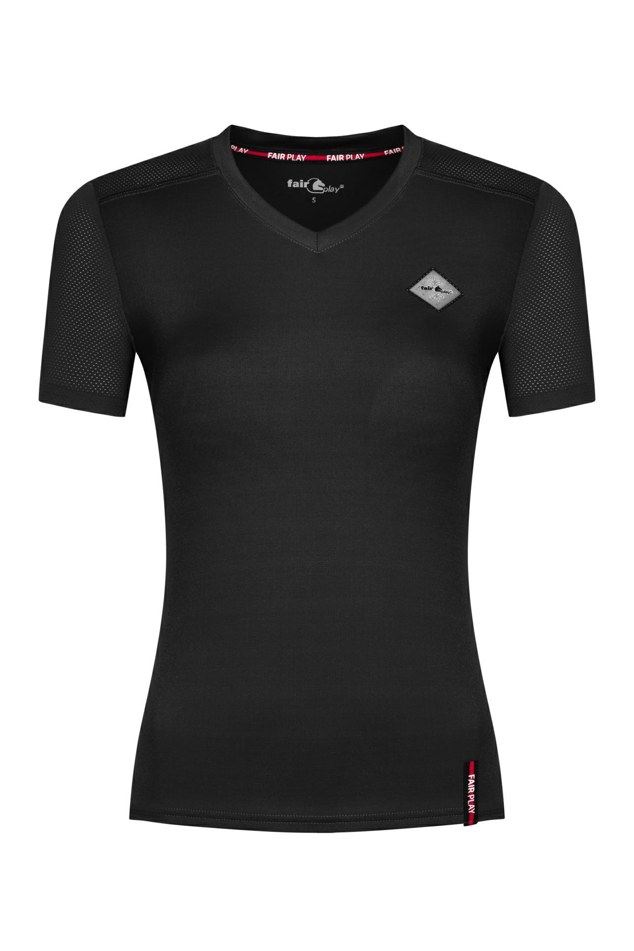 • Camiseta deportiva y funcional con cuello en V • Confeccionada con un tejido de punto ultraligero, transpirable y de secado rápido con UVP 30 • Mangas e inserciones en la espalda de malla elástica para una máxima transpirabilidad • Insignia 3D con Fair Play logotipo en el frente