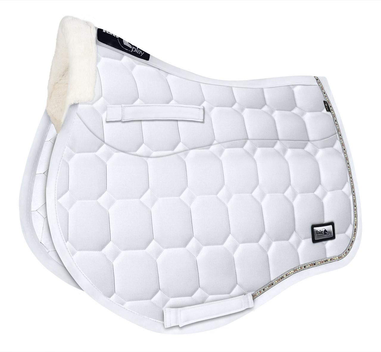 •La mantilla para montar a caballo proporciona una excelente amortiguación entre el lomo del caballo y la silla, a la vez que protege contra la abrasión.• Fabricada con un tejido transpirable (76% nailon + 24% spandex con protección UV 50+)• Buenas propiedades de absorción de impactos gracias al forro con piel de oveja artificial en el interior y en la cruz• Ideal para caballos con piel sensible• Forma anatómica y perfilada para un ajuste perfecto al lomo del caballo• Forro transpirable y de secado rápido• Interesantemente acolchado, decorado con una cuerda doble y una cadena de metal con pedrería multicolor• Anillas en D en la versión mantilla de doma• Decorado con el logo Fair Play
