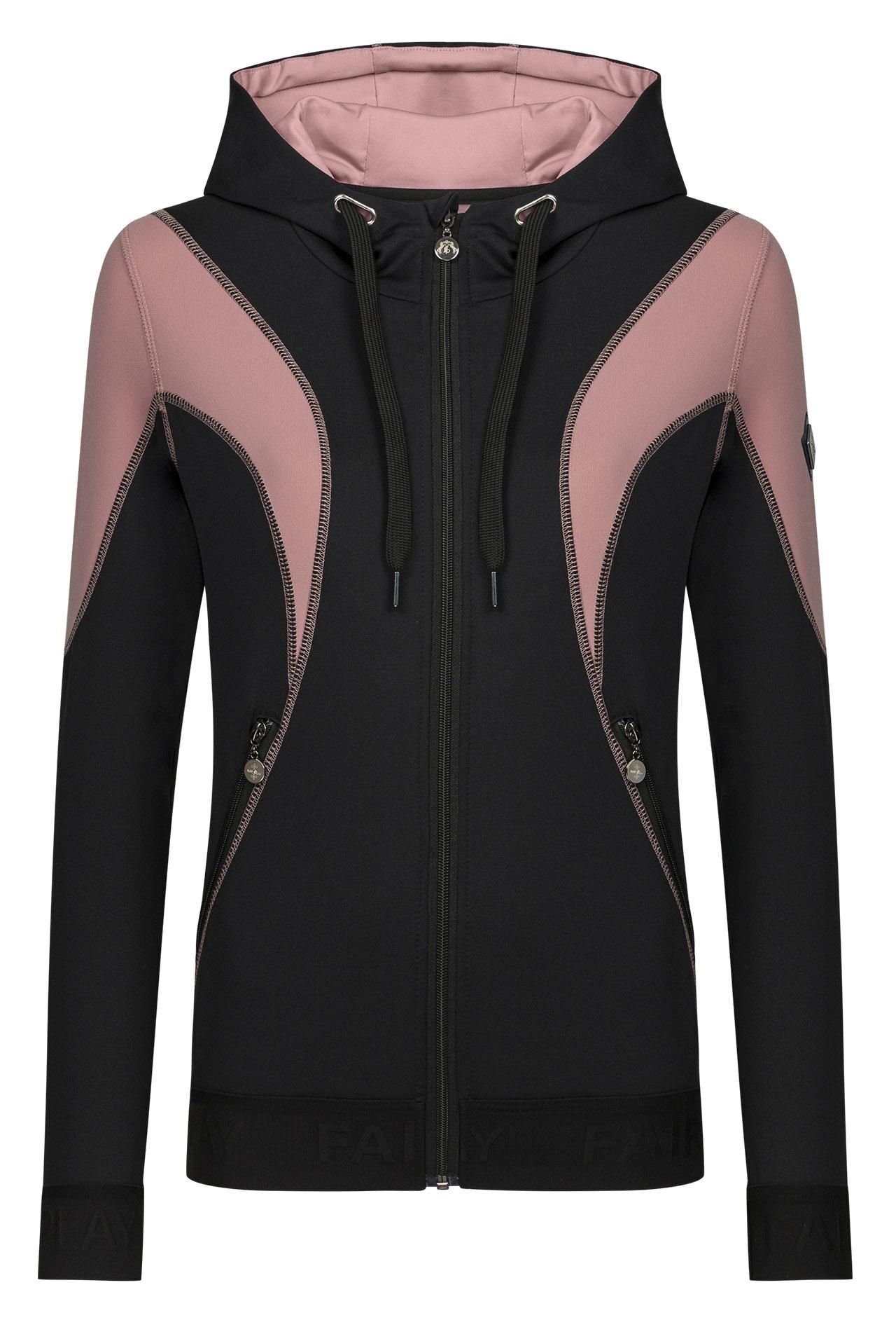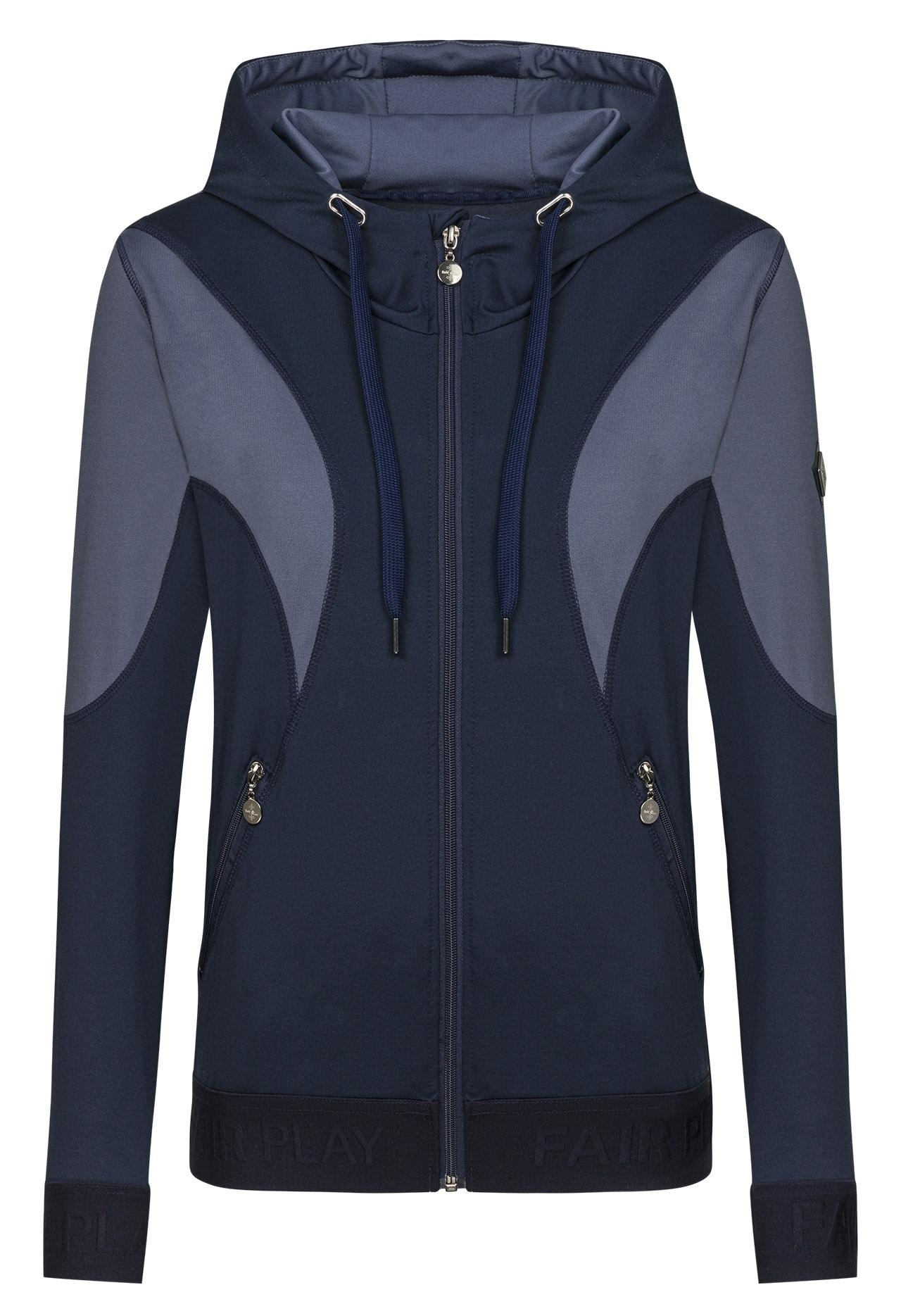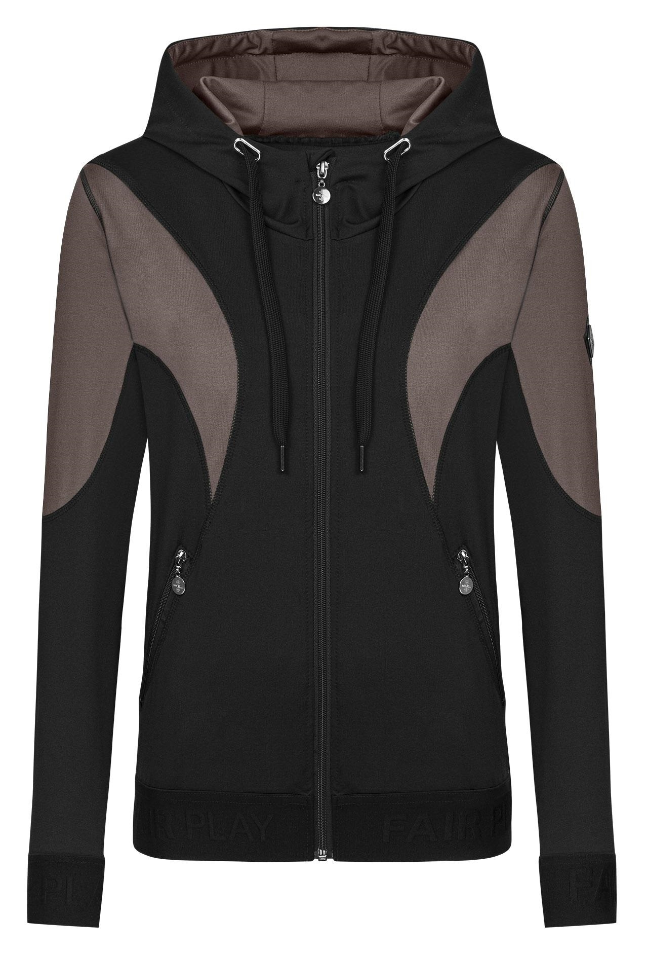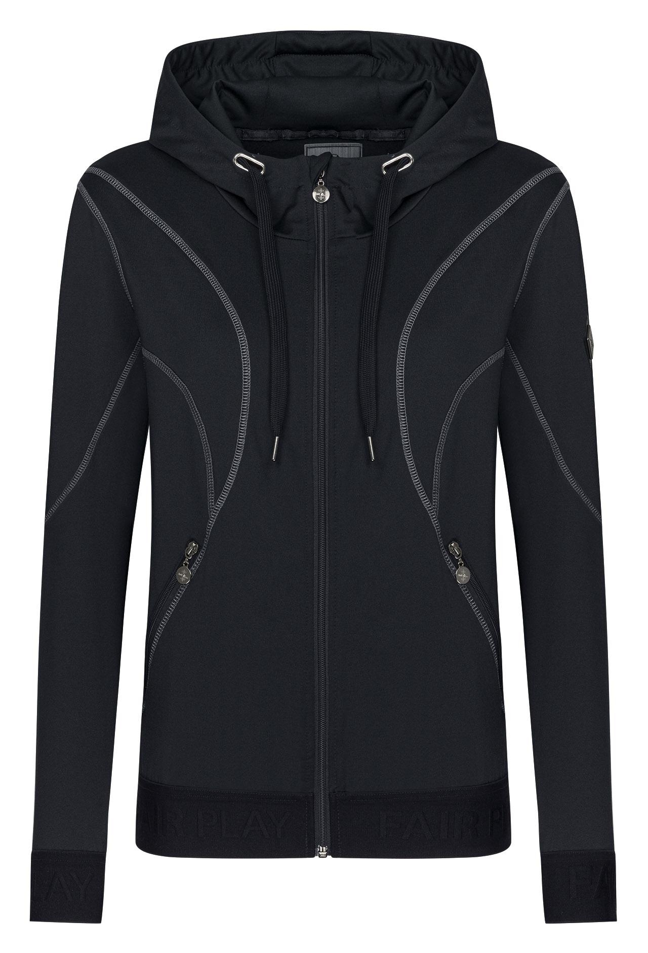 • Sudadera deportiva con cremallera confeccionada con un tejido suave y cálido cepillado en el interior • Extremos de las mangas y parte inferior de canalé elástico con el logotipo de Fair Play en relieve • Dos amplios bolsillos delanteros con cremallera para un teléfono inteligente • Inserciones contrastantes o costuras superiores en la parte delantera, trasera, Las mangas y el interior de la capucha le dan un aspecto deportivo.
