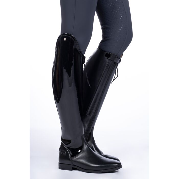 Botas de montar -Lynette- ancho corto/estándar, Botas de montar -Lynette- ancho corto/estándar con parte elástica cuero de alta calidad charol con botón automático pie estrecho cremallera al lado soporte para espuelas suela de espuma con memoria semirrígido parte exterior altura del arco de doma 6,5 cm El mejor producto ecuestre de competición en tienda hípica El Estribo Alicante +34648425534