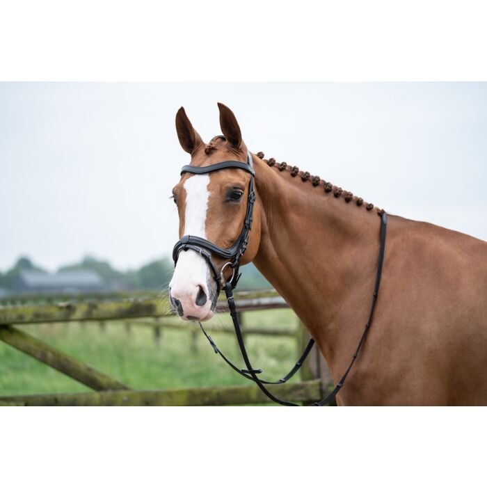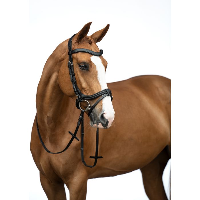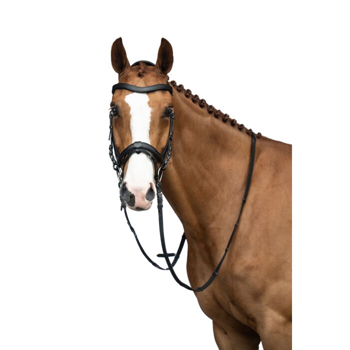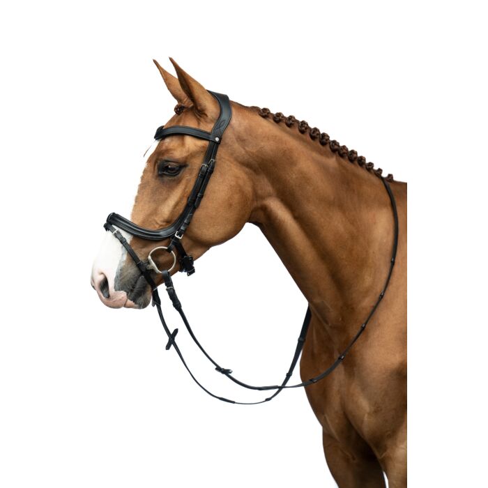 Cabezada -Atomic-, Cabezada -Atomic- correa de naríz y frente con funda muy suave sin bocado cuero de alta calidad frontaleraalmohadillada con hebillas para desviar la cinta riendas de cintas pieza ancho con abertura para el oído con correa cierraboca desmontable Nota: Según la LPO, el latigazo en la garganta es obligatorio en las competiciones.