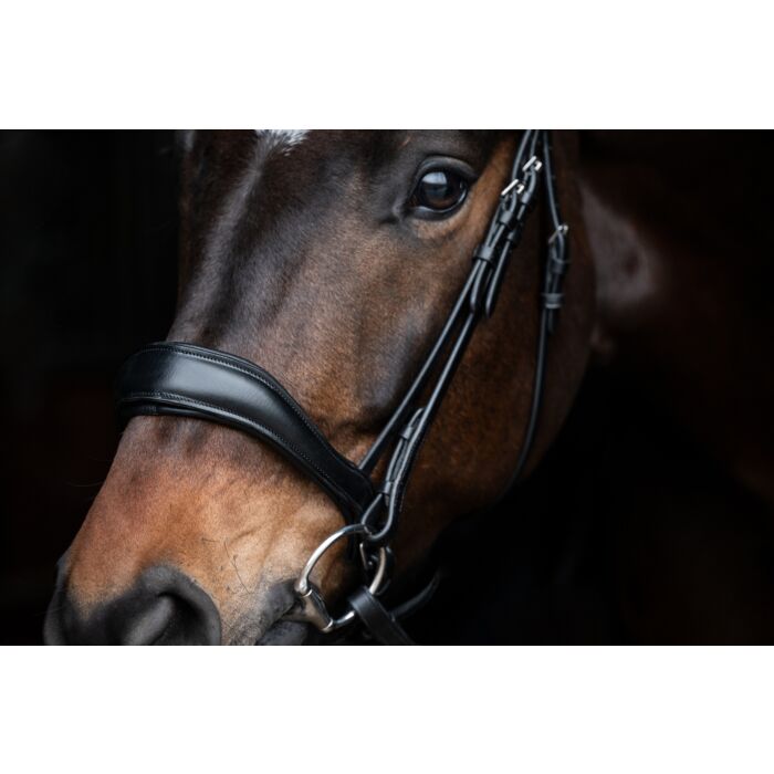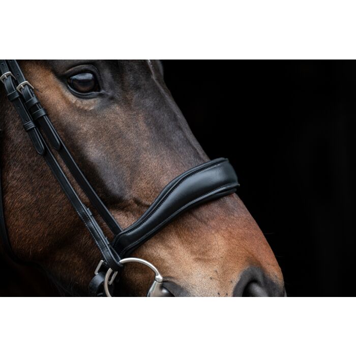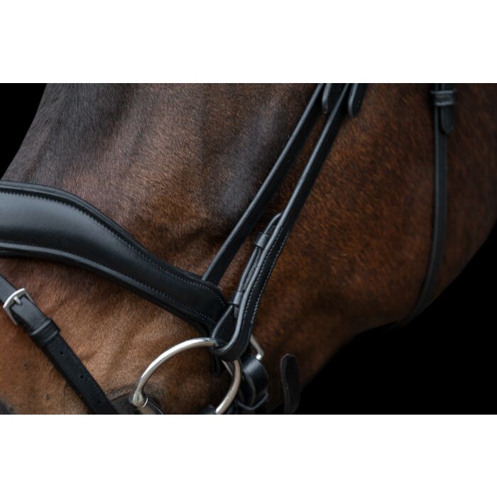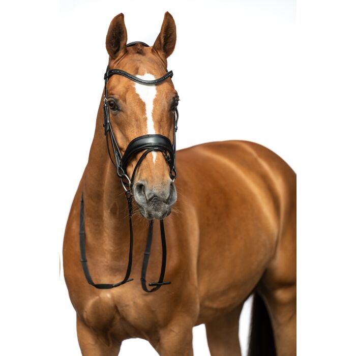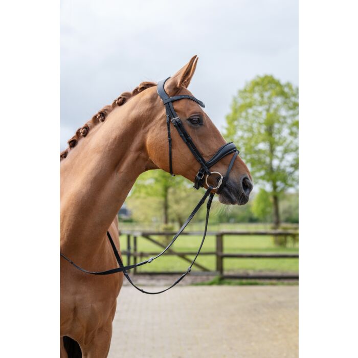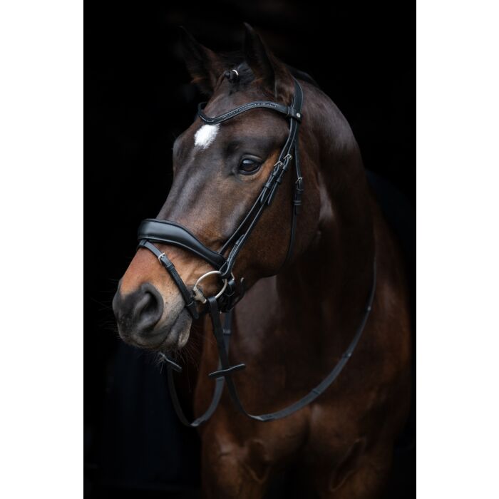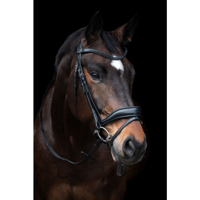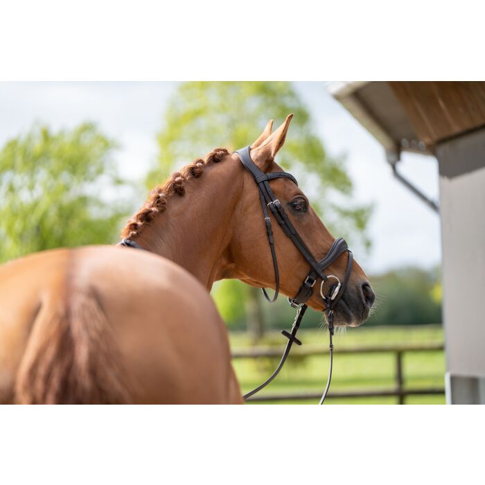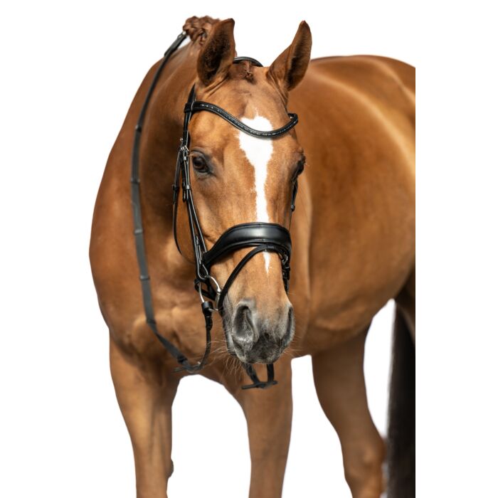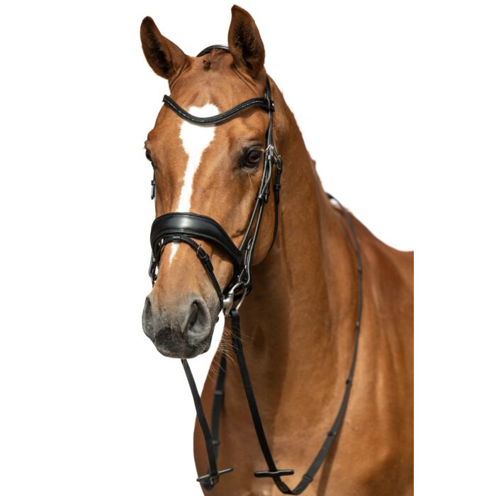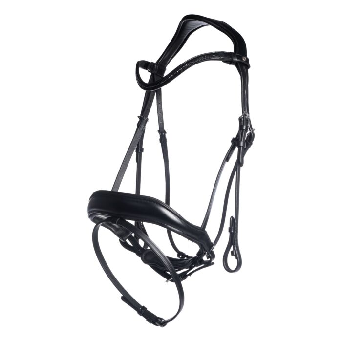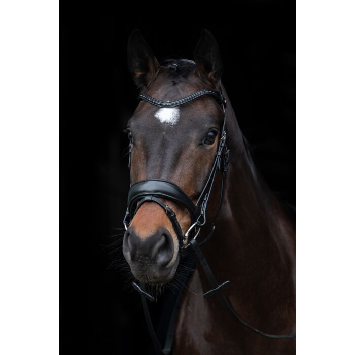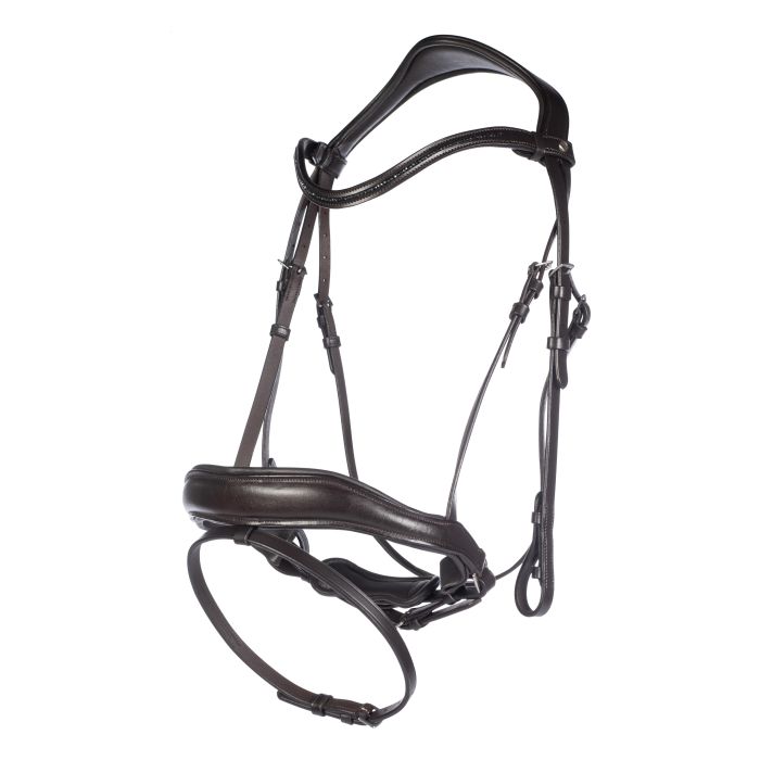Cabezada -Ira-, Cabezada -Ira- máxima comodidad riendas con mosquetón sin bocado vaqueta piel natural supersuave con hebillas para desviar la cinta muserola acolchada casco acolchado pieza ancho con abertura para el oído correa ajustable por ambos lados frontalera con pedrería riendas unidas con topes de cuero frontalera fácil de quitar, con botones correa de cierrabocas desmontable con correa cierraboca desmontable El mejor producto ecuestre de competición en tienda hípica El Estribo Alicante +34648425534