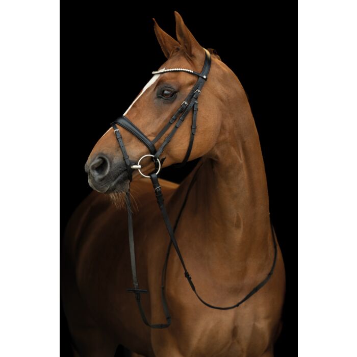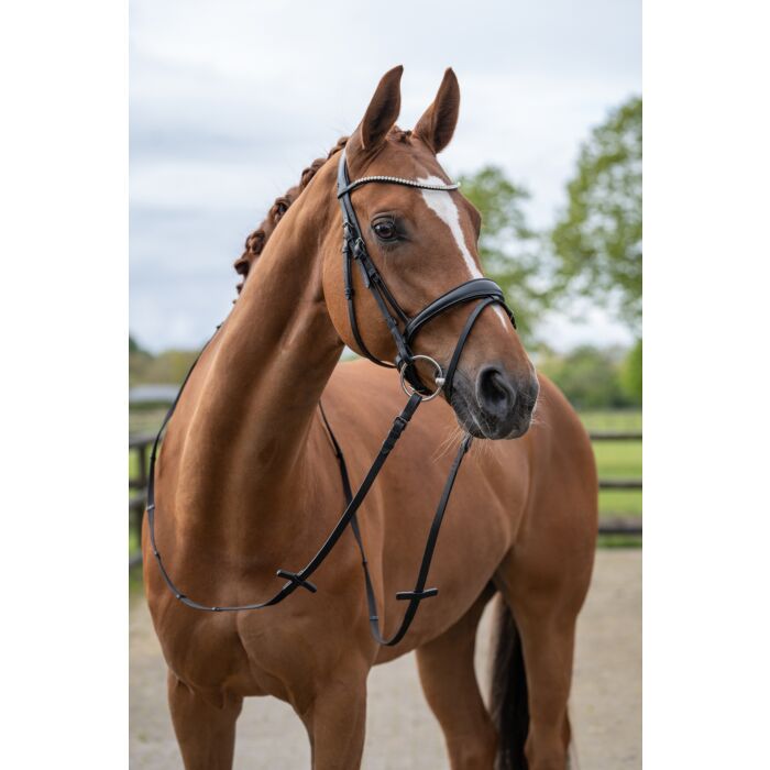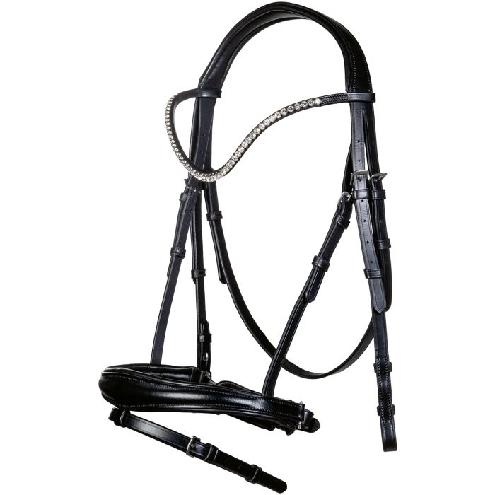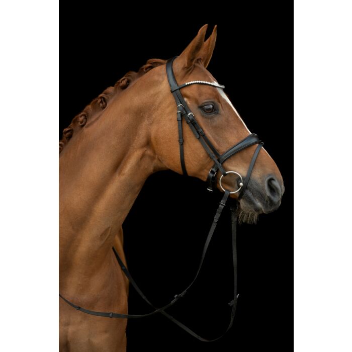 Cabezada -Melinda-, Cabezada -Melinda- correa de naríz y frente con funda muy suave sin bocado vaqueta hebillas estables plateadas con hebillas para desviar la cinta intermedia frontalera con pedrería riendas unidas con topes de cuero muserola cónica curvado en la frente El mejor producto ecuestre de competición en tienda hípica El Estribo Alicante +34648425534