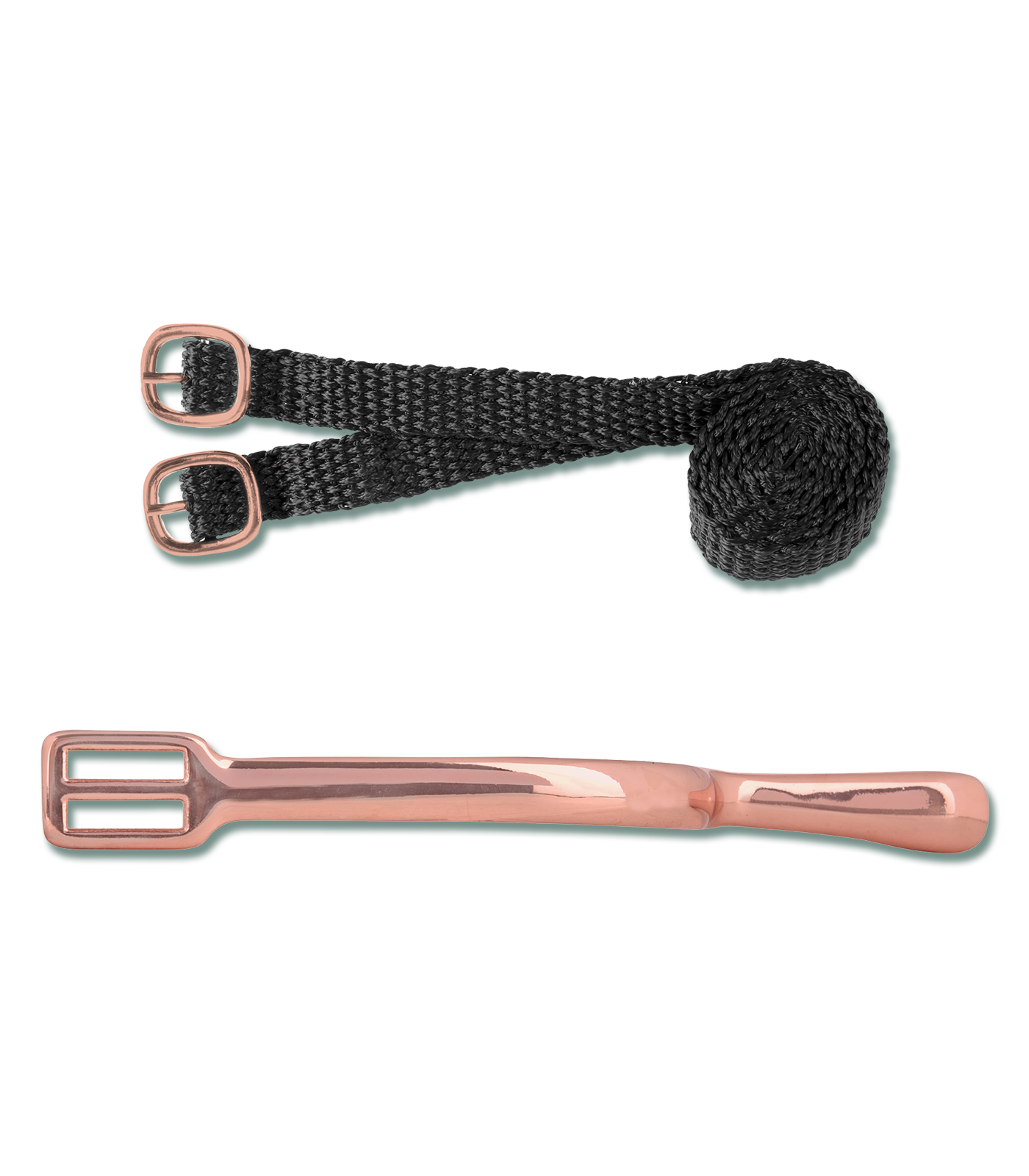 Espuelas de excelente calidad, hechas de acero fino, en aleación oro rosado. Aciones de perlón con hebilla de acero fino en oro rosado. Set de un par.