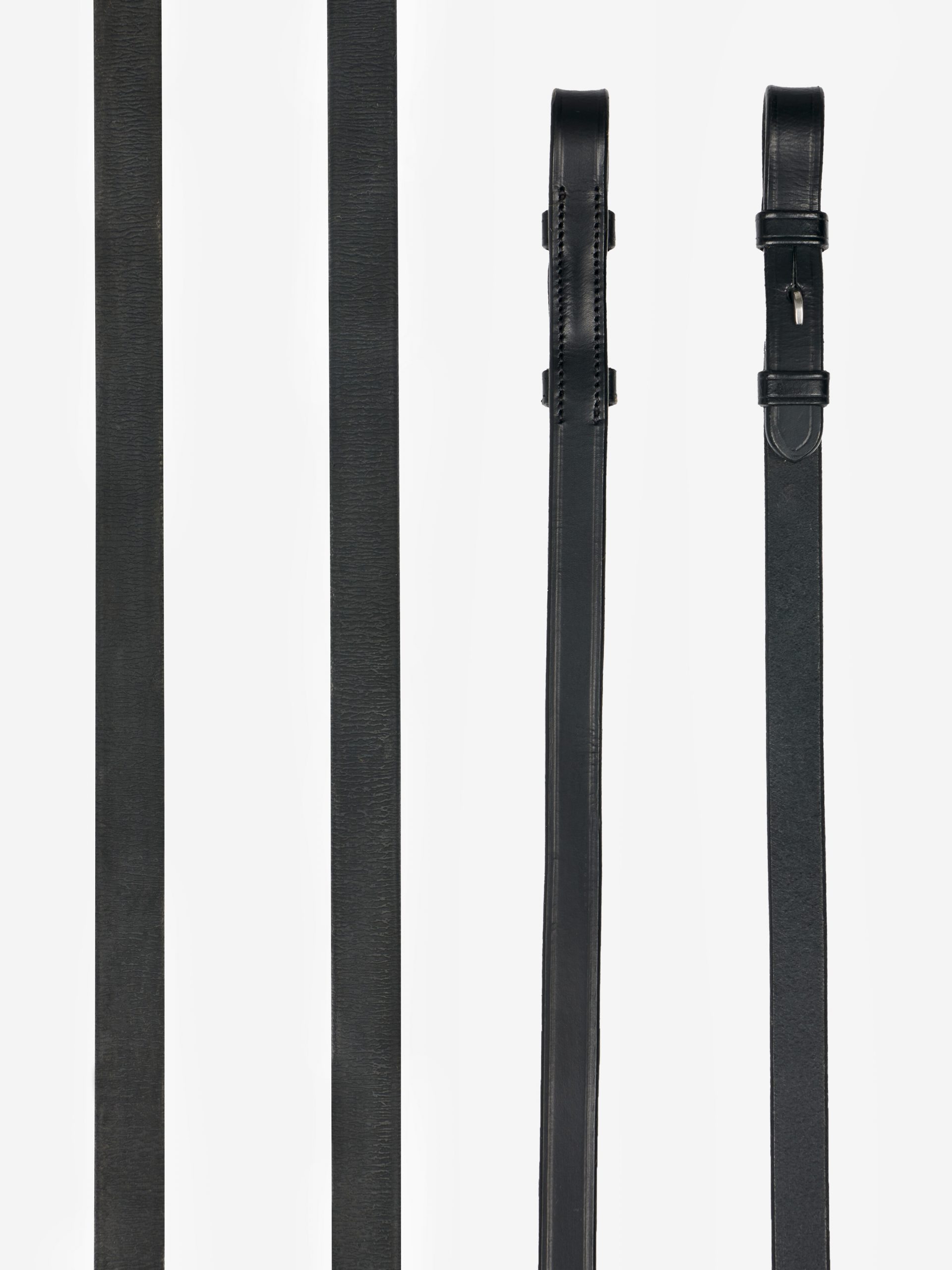 Las riendas de goma extremas Lemieux Kris son riendas de agarre recto con una superficie discretamente texturizada. Forrado con nylon para evitar el estiramiento y complementado con los tapones de cuero de cuero de marca. Las riendas de goma extremas de Kris vienen con fijaciones de plata.